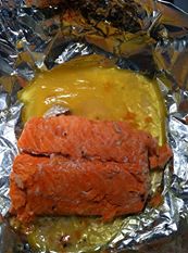Salmon in a pouch, or Salmon en papillote (which really means parchment, but aluminum works just as well), as the French call it. You can add anything you like. I took 1 tablespoon of butter, 1 tablespoons olive oil, juice from one lemon, 1 tablespoon of brown sugar, and liberally put salt and pepper into a bowl to mix together. This was the marinade for my salmon. I let it sit for about 5 min (you don’t want any ingredients to overpower the fish) then used my hands to massage the fish. Then I put it in its “papillote” and in a 400 oven for 5-10 min. And viola! Magnifique!