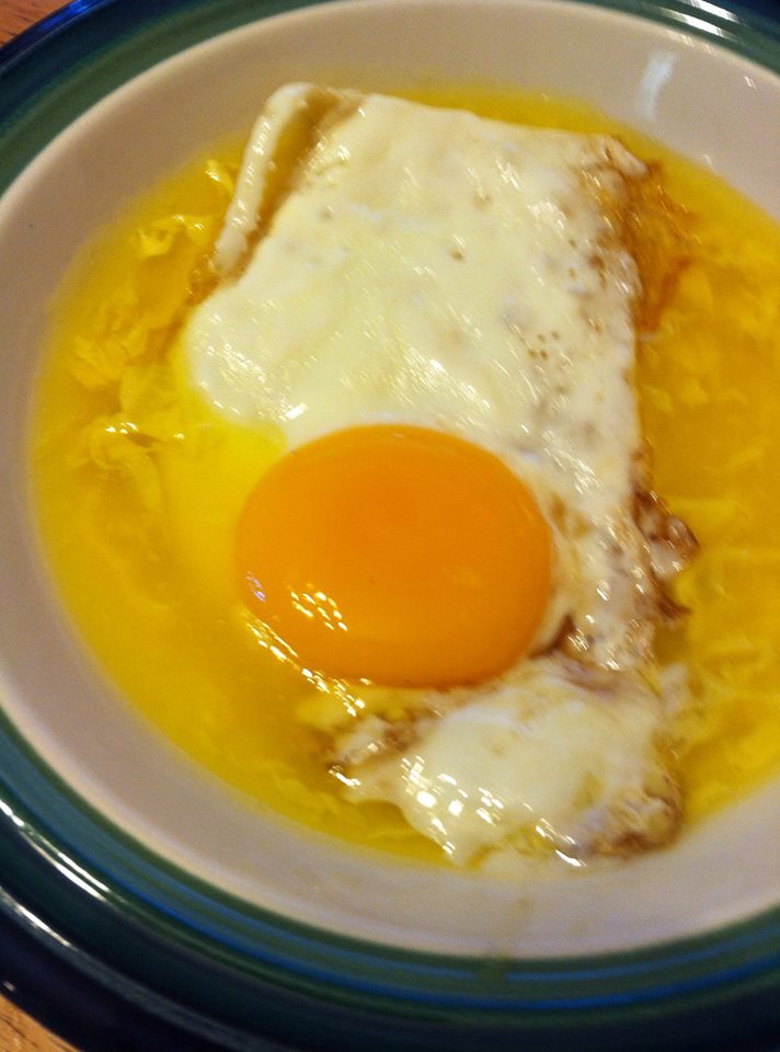 My girls LOVE runny eggs, sunny-side up is their favorite. So when I was trying to sell the leftover Chinese food we had in the fridge, I knew I had to top it with these beautiful eggs. B is an egg drop soup fanatic, so when I topped her beloved soup with an extra egg, she thought she had hit the jackpot. For my dinner, I defrosted some homemade chicken stock, added lo mien noodles, broccoli, and chicken. Of course, I love runny eggs as much, if not more than the girls, so I topped my faux pho with an egg as well. For K, my 4 year-old? Well, she is going through a bit of a phase where she doesn’t want her food to be combined. So her chicken, rice, and egg were all on her plate, but not combined. It was still pretty, but before I could snap a pic, she had already almost finished her entire egg.
