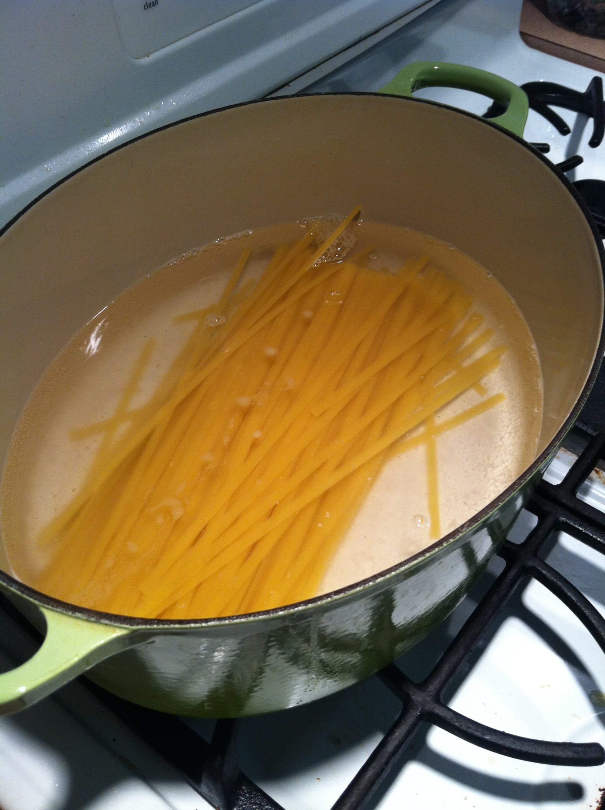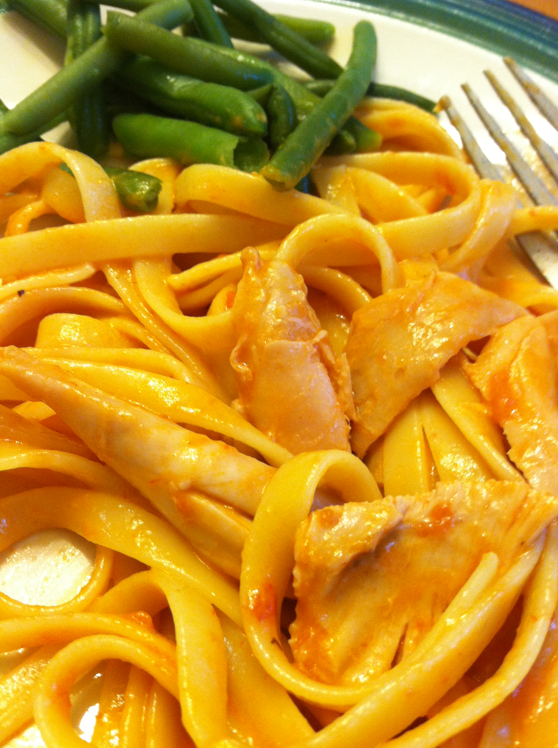 Cook pasta to al dente. Mix with chicken and sauce. 10 thumbs up! Plus, more for leftovers!