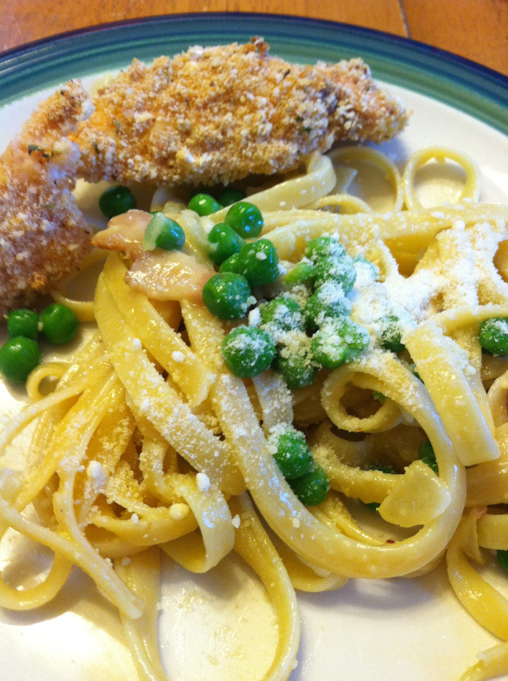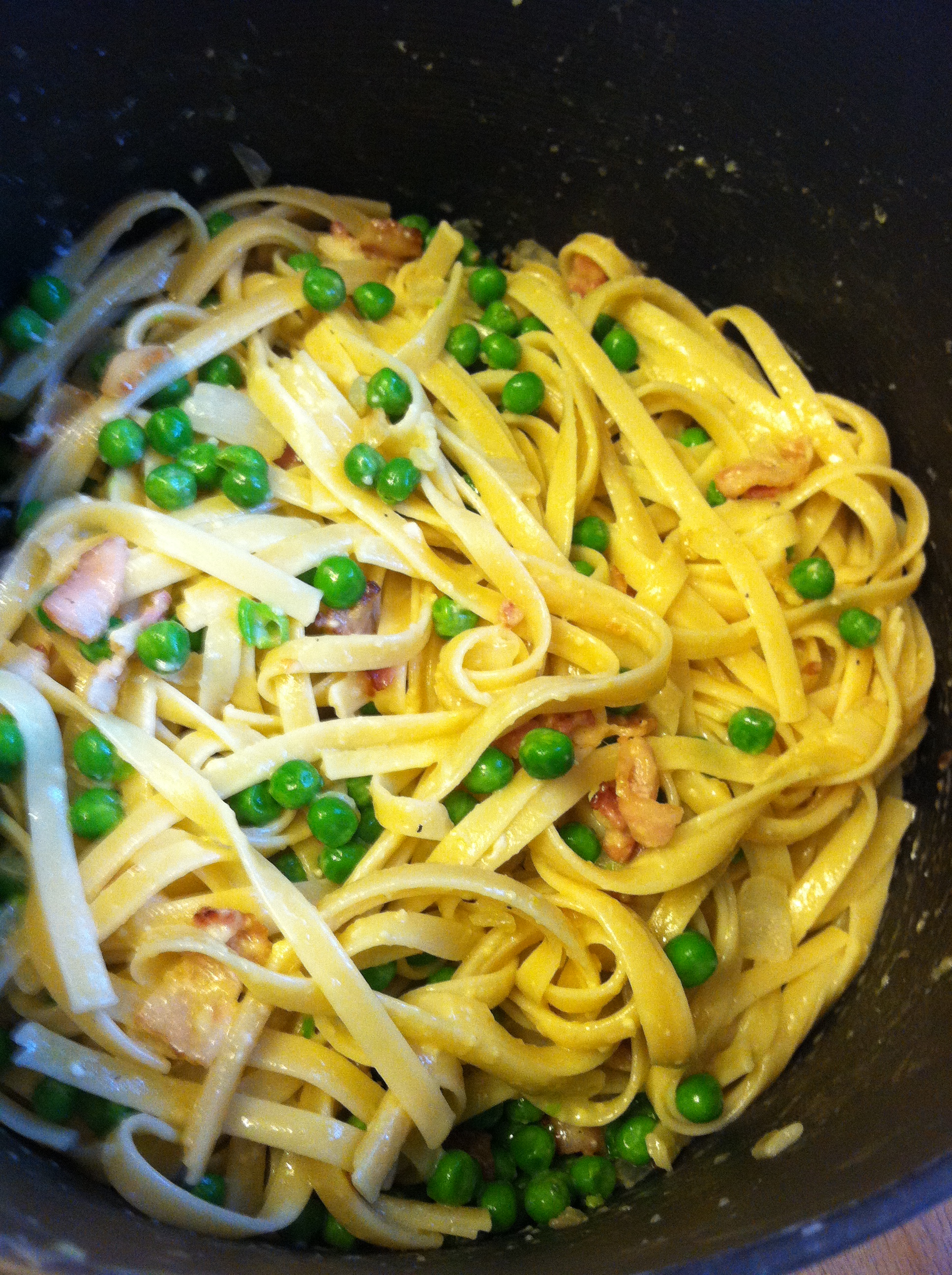 Place frozen peas at the bottom of your serving bowl; they will heat up and cook through with hot pasta.