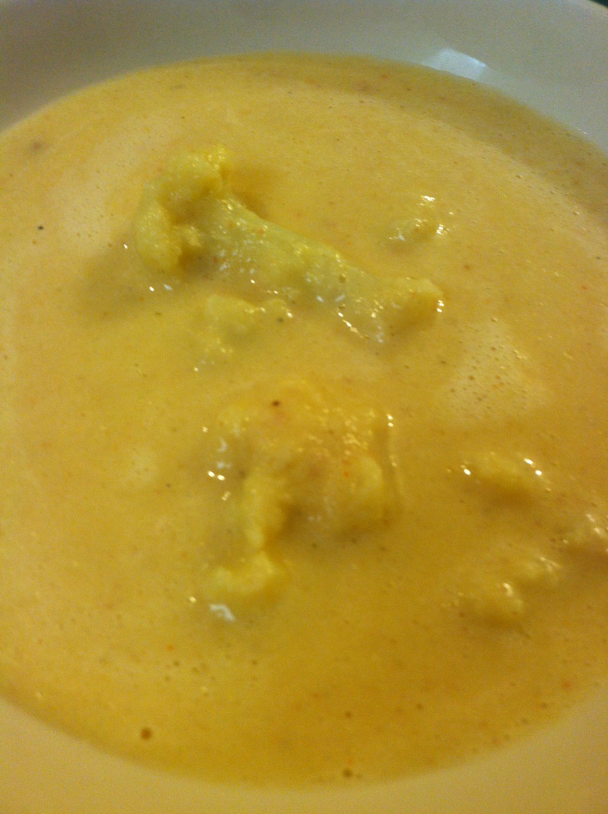 I steamed the cauliflower in some chicken stock with the bacon and garlic until soft. Then I added about half of the beer cheese. Then I blended it with my immersion blender. You could use a regular blender if you don’t have an immersion one. Just add a bit at a time so you don’t spill or burn yourself. I blended it well, but left in a few pieces of cauliflower.