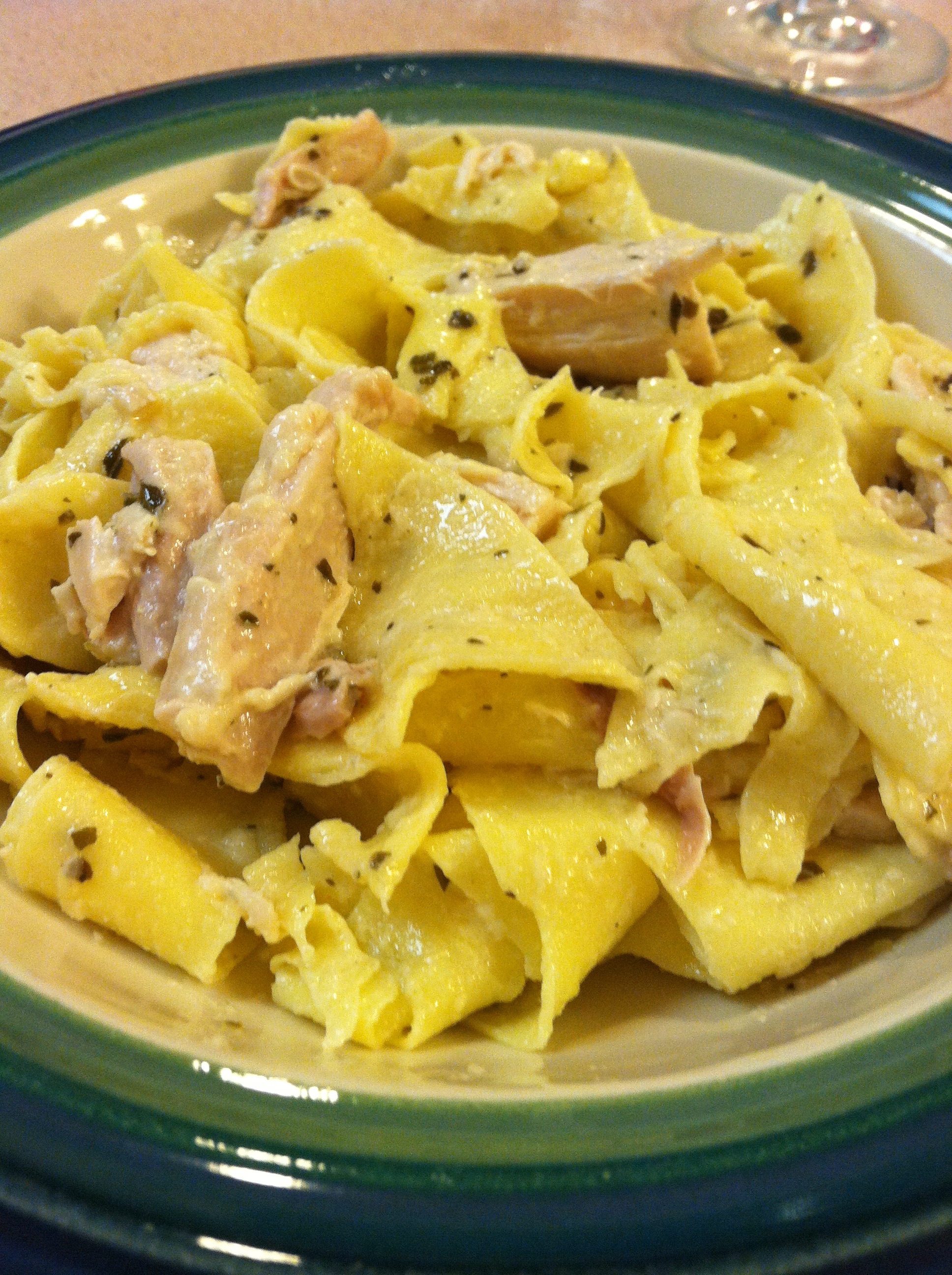 Homemade Pasta- In the food processor, use 4 eggs and add flour until it firms up. Pull apart your dough a few sections at a time and roll out in pasta machine. Cut rustic long noodle shapes – You could just use fresh (like Burtoli or your favorite dried pasta)