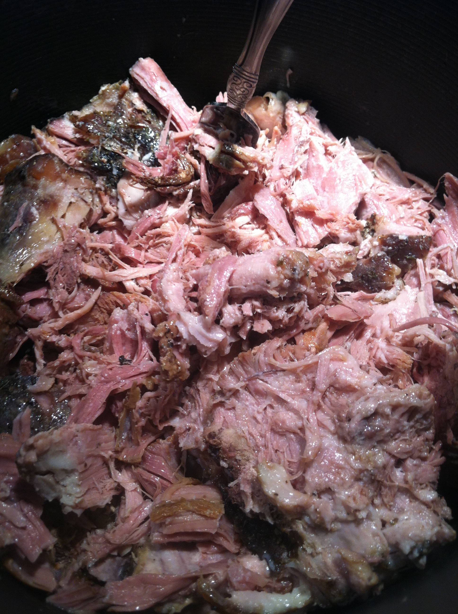 1 pork butt (this would work well for chicken) heavily seasoned with salt, pepper, onion and garlic powder. Add a couple of cups of beef or pork stock. Cook all day in a crock pot on low for 8 hours or high for 4 hours.