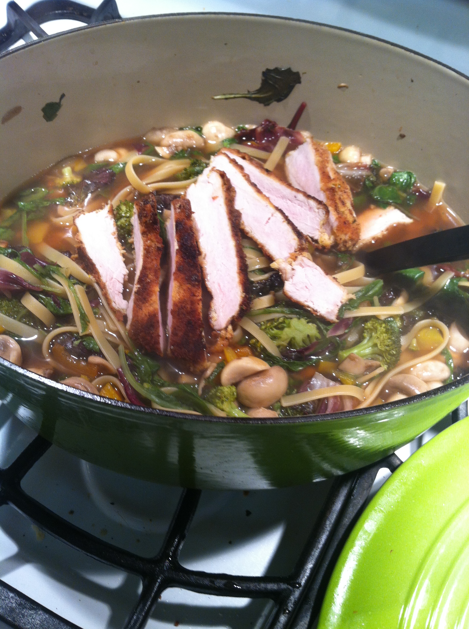 Hey guys! Tonight was another girls’ might for me and my girls. E wanted cheese ravioli, R and K wanted spaghettios, and I wanted to try to clean out the fridge a bit and have something with lots of veggies. I decided to make a noodle soup with some leftover veggies and a pork chop left over from last night. This was pretty simple to throw together in one pot.