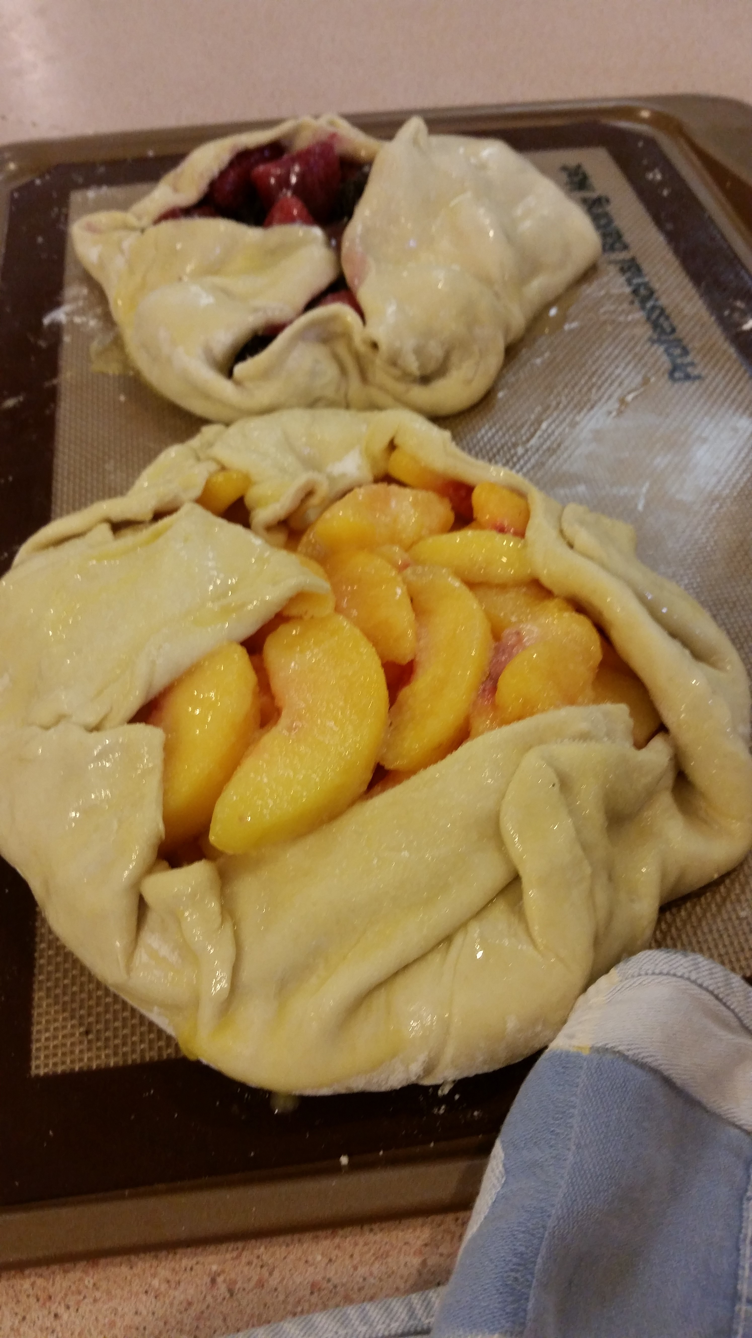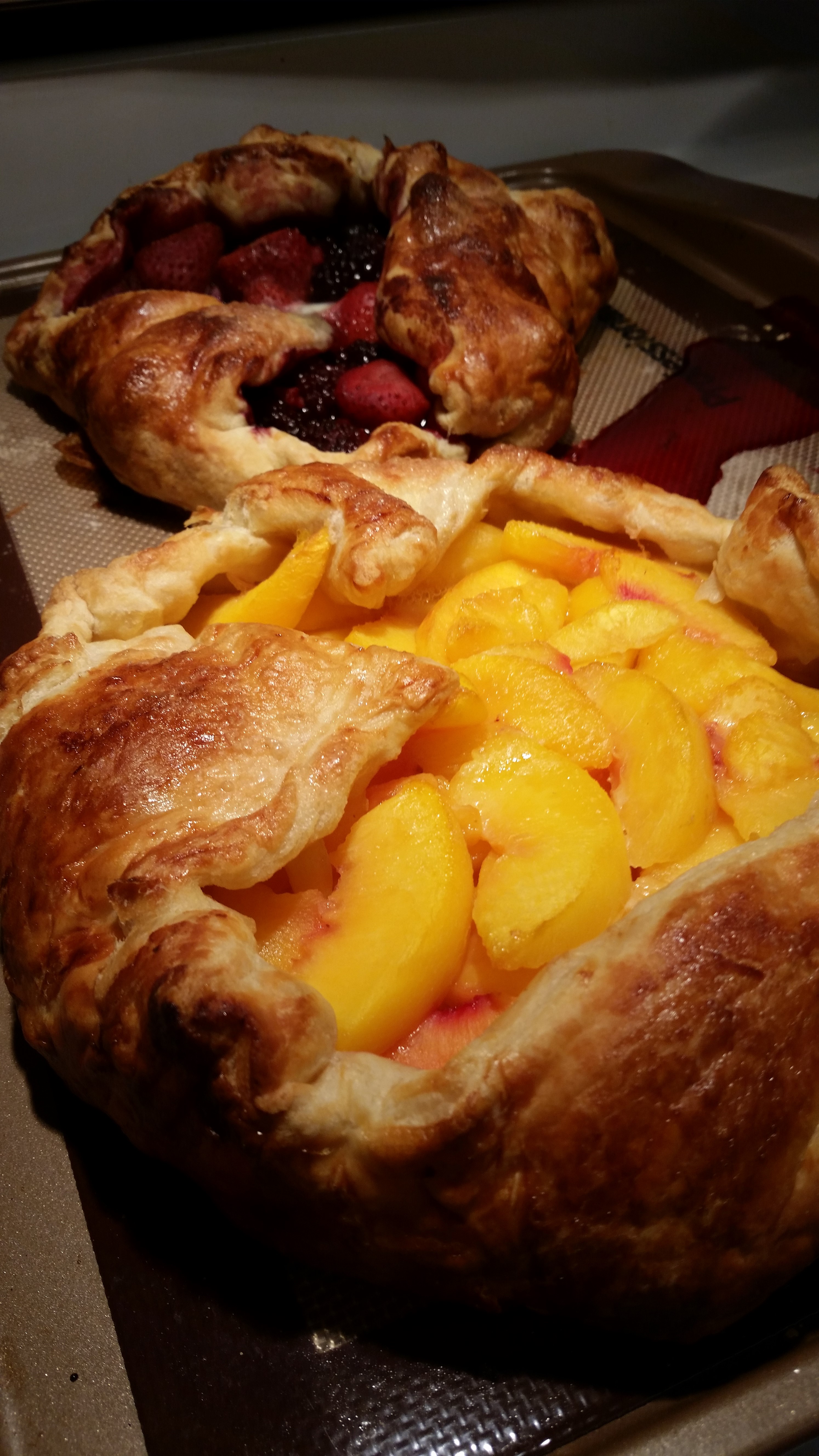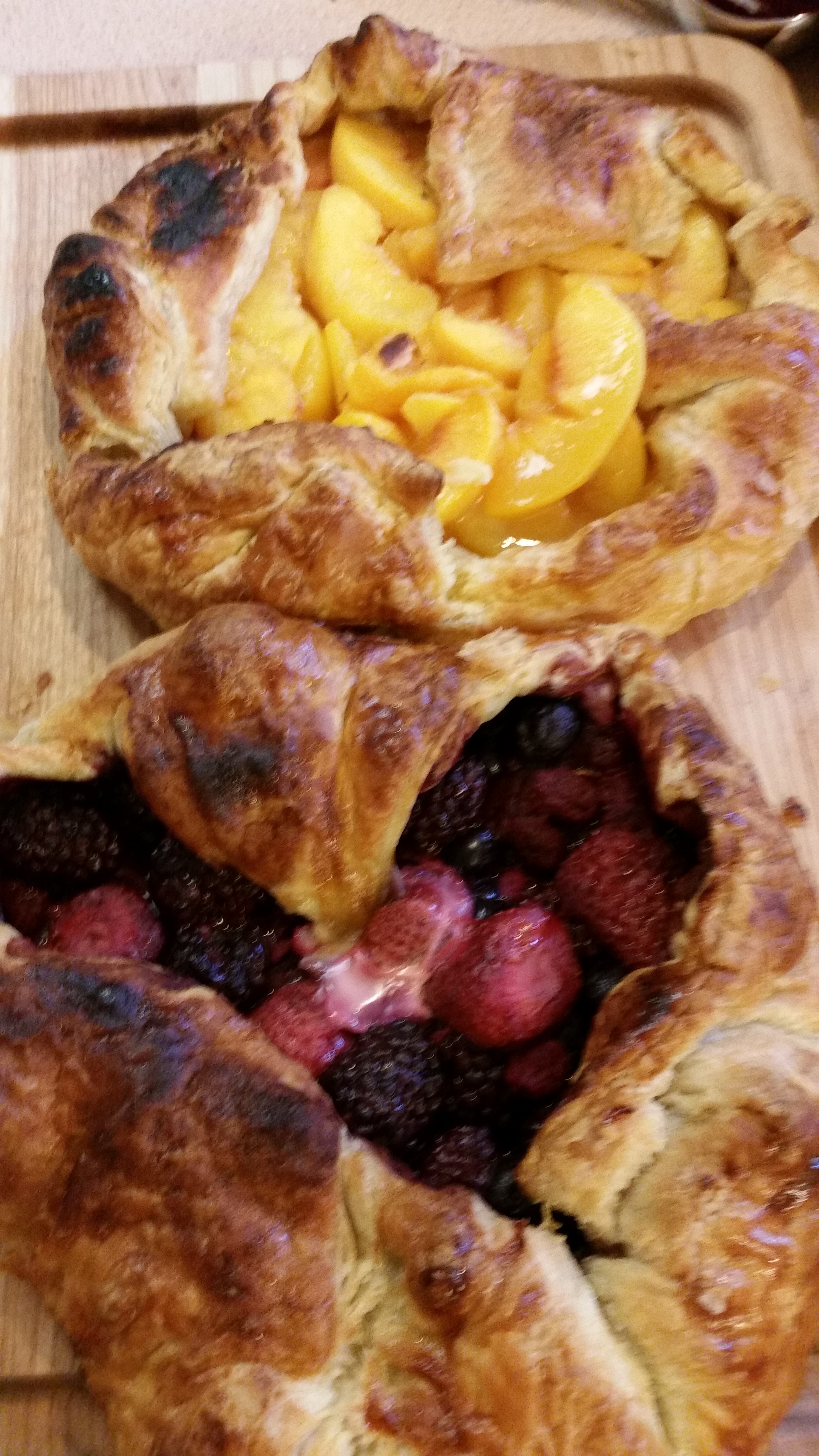 These were so easy. All I did was defrost some frozen fruit (I used peaches and a berry blend). I used 2 puff pastry shells. I put the fruit in the middle of the puff pasty and enclosed the sides.