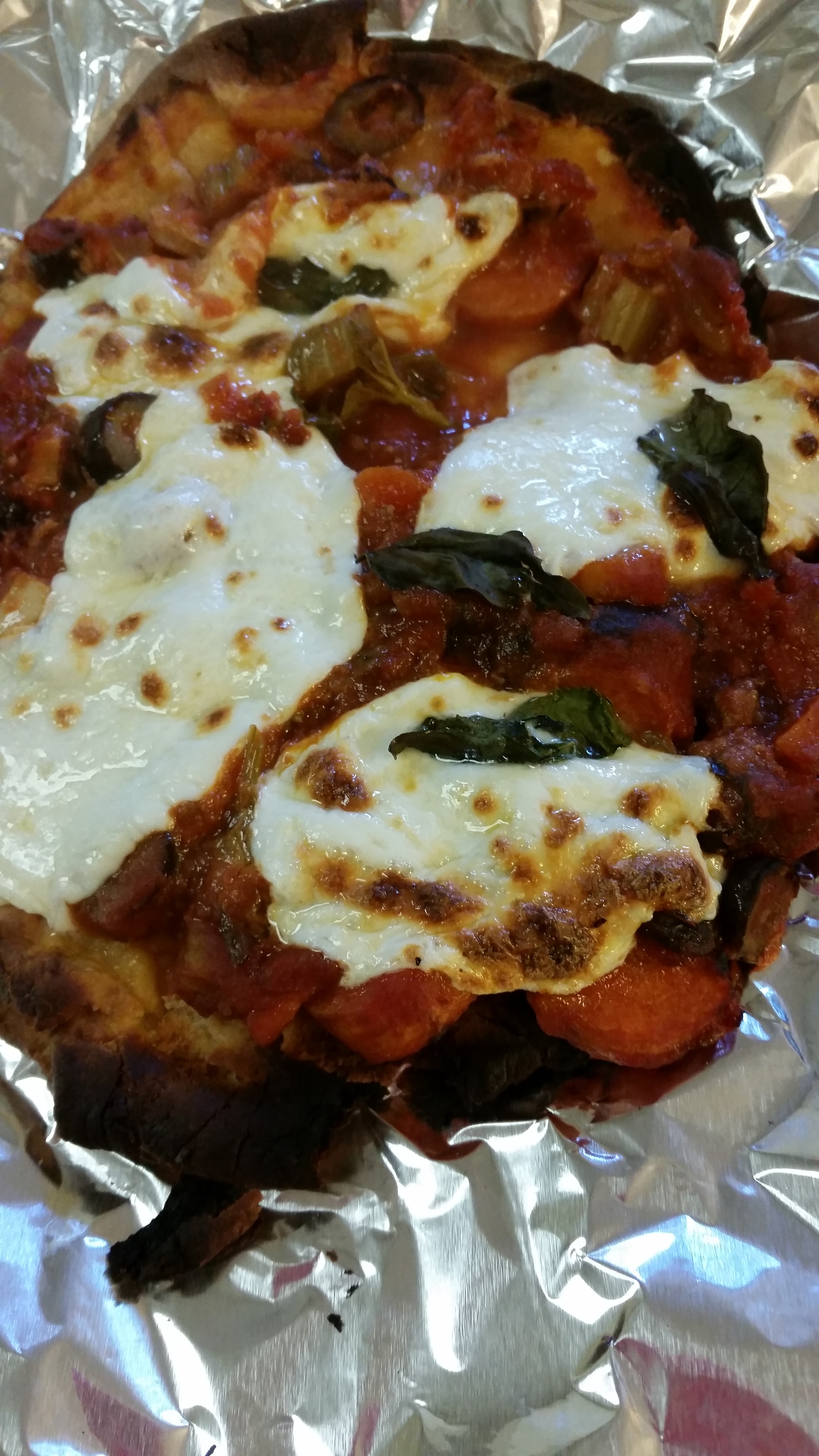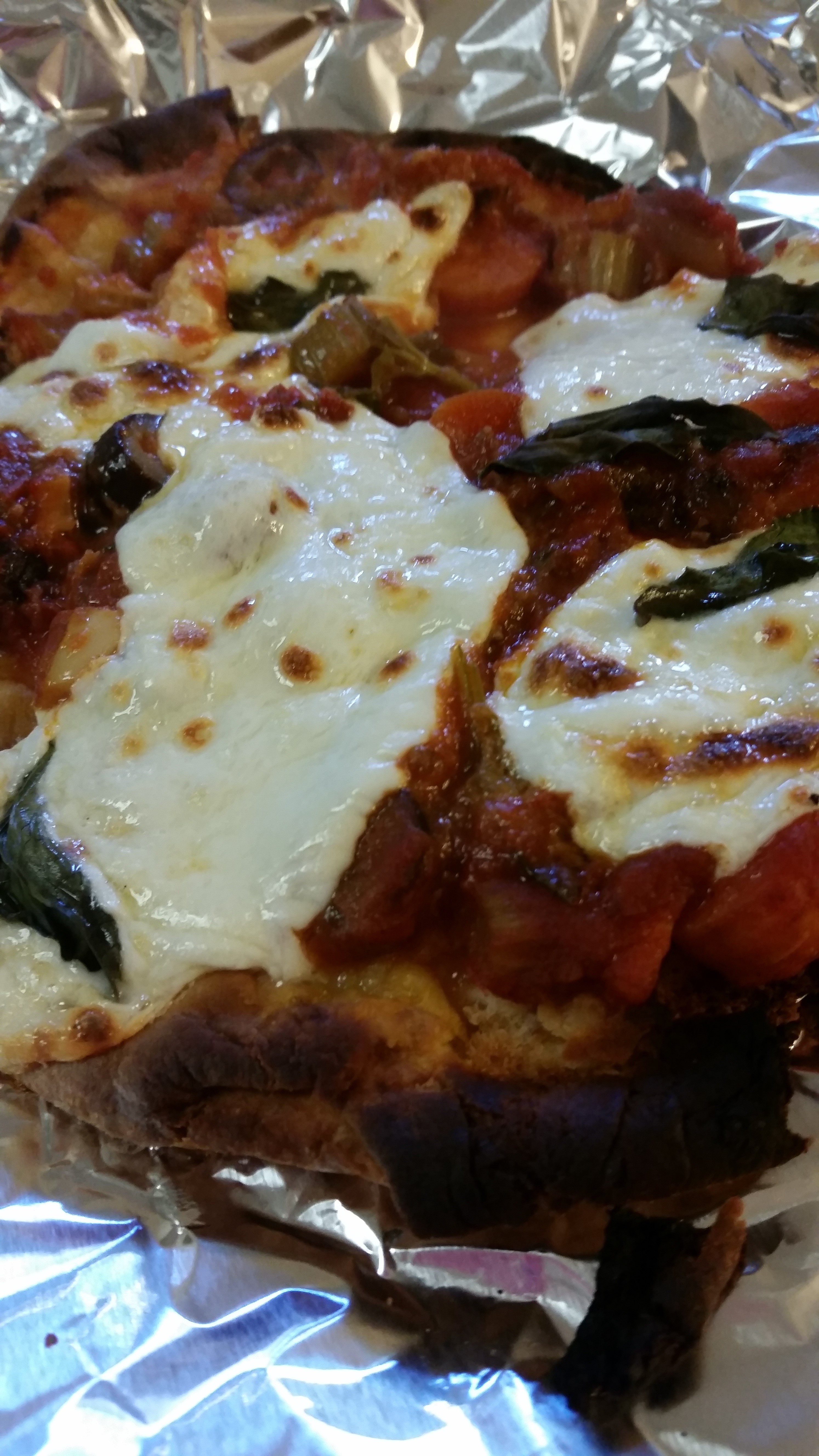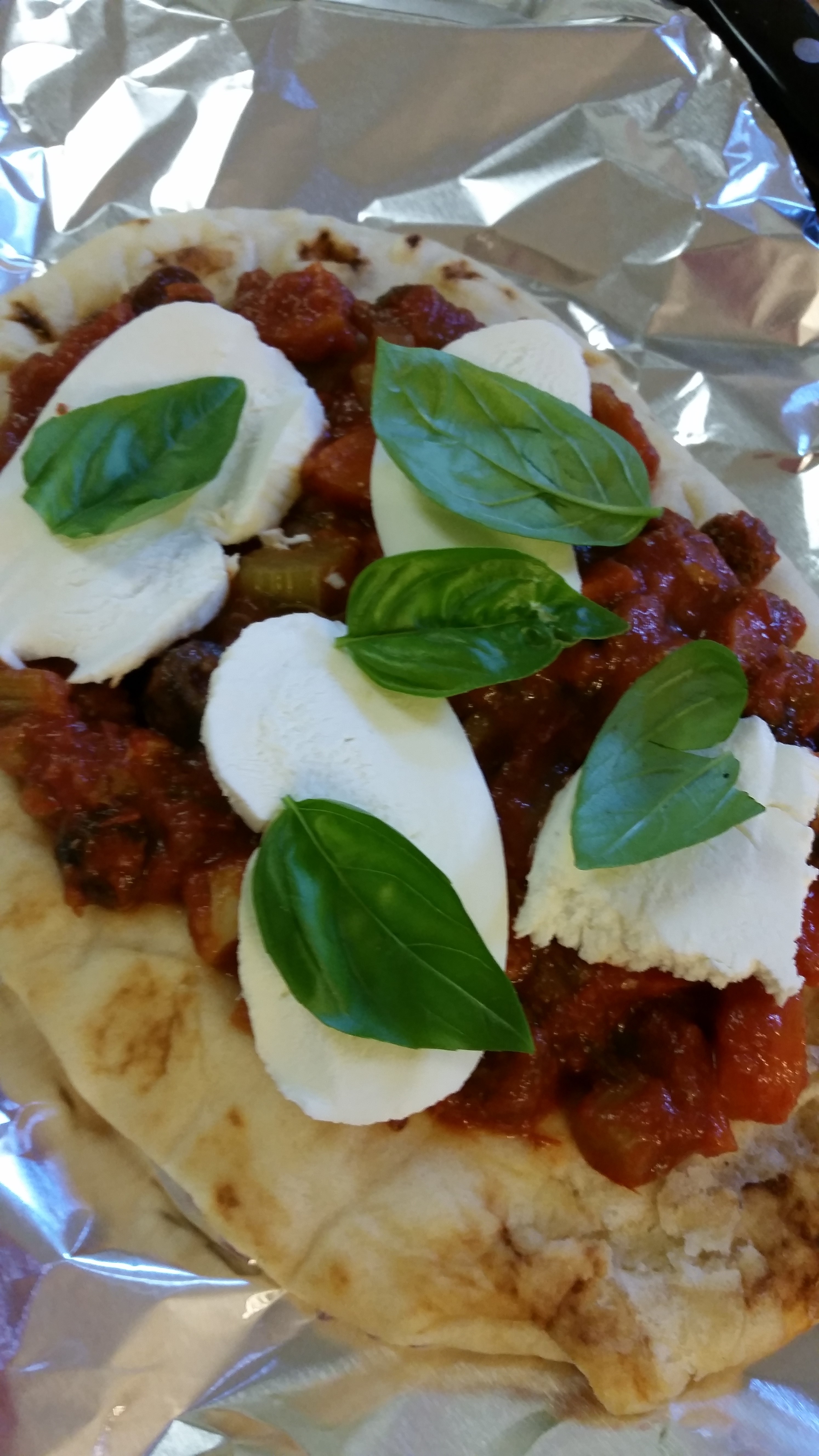 Margarita Naan Pizza- so simple…1 piece of Naan bread, a tablespoon of my leftover sauce minus the meatballs (you can totally use a shortcut and buy your favorite homemade sauce) https://funfoodiefamily.com/2014/05/14/meatball-subs/, sliced mozzarella cheese, fresh basil. Cook at 500 for 10 minutes. Then I turned the oven to high broil with the oven door open for 5 minutes. Perfection!