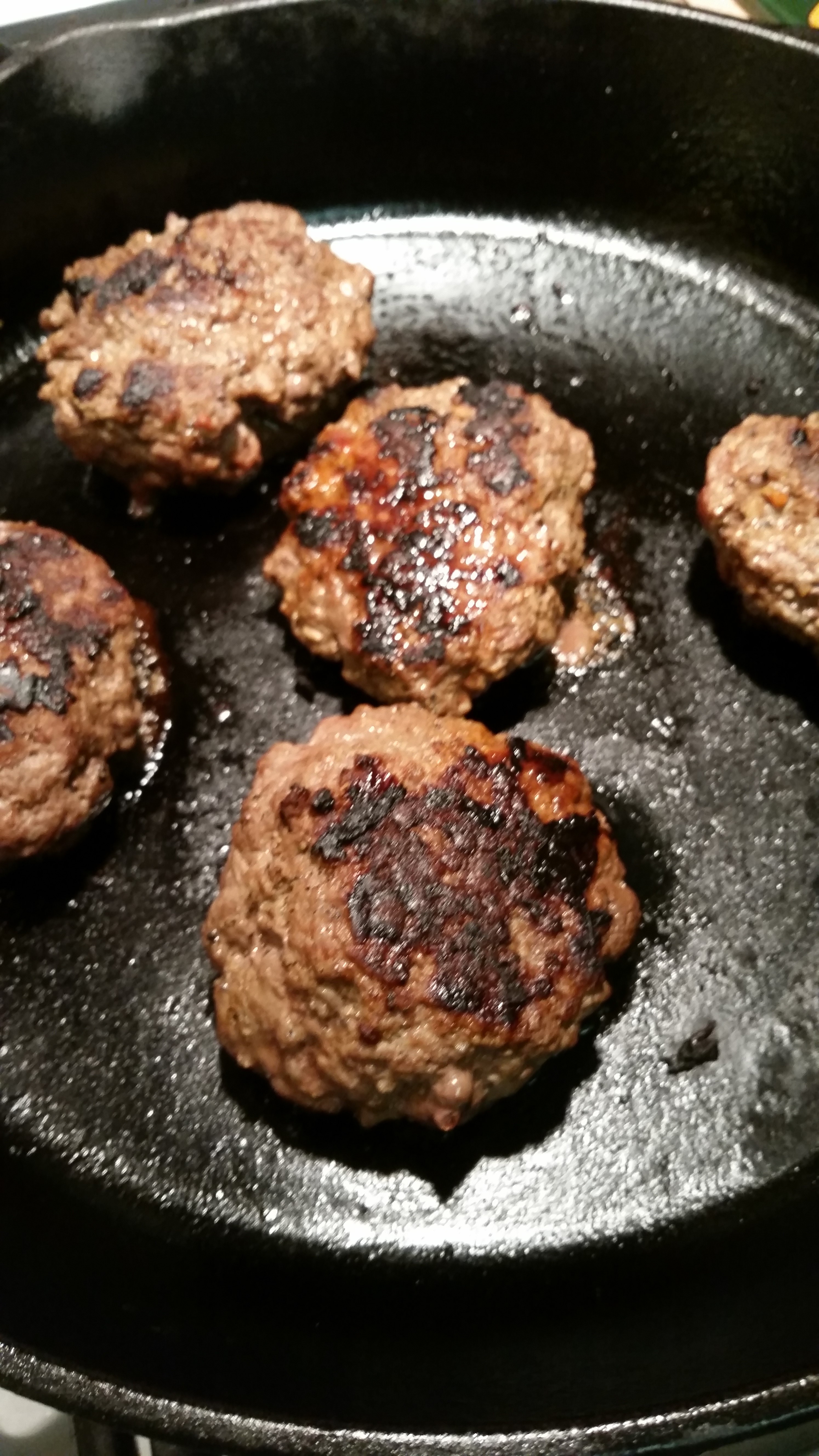 Now on to the pan. Grills are fine. Cast iron grills are better. Cast iron pans are the best. I love how the burgers get that yummy crust and picks up all the flavoring of the cast iron pan, not to mention adds to the pan’s flavoring. Make sure your pan is SCREAMING hot so they don’t stick. Add the burgers and leave them. DO NOT PRESS ON THE BURGER! Resist the urge to turn them over until they are ready… I can tell they are ready when a see a tiny crust forming and about half of the burger seems to be turning from pink to brown. I say about 6 minutes or so. Turn it; behold it’s glory….