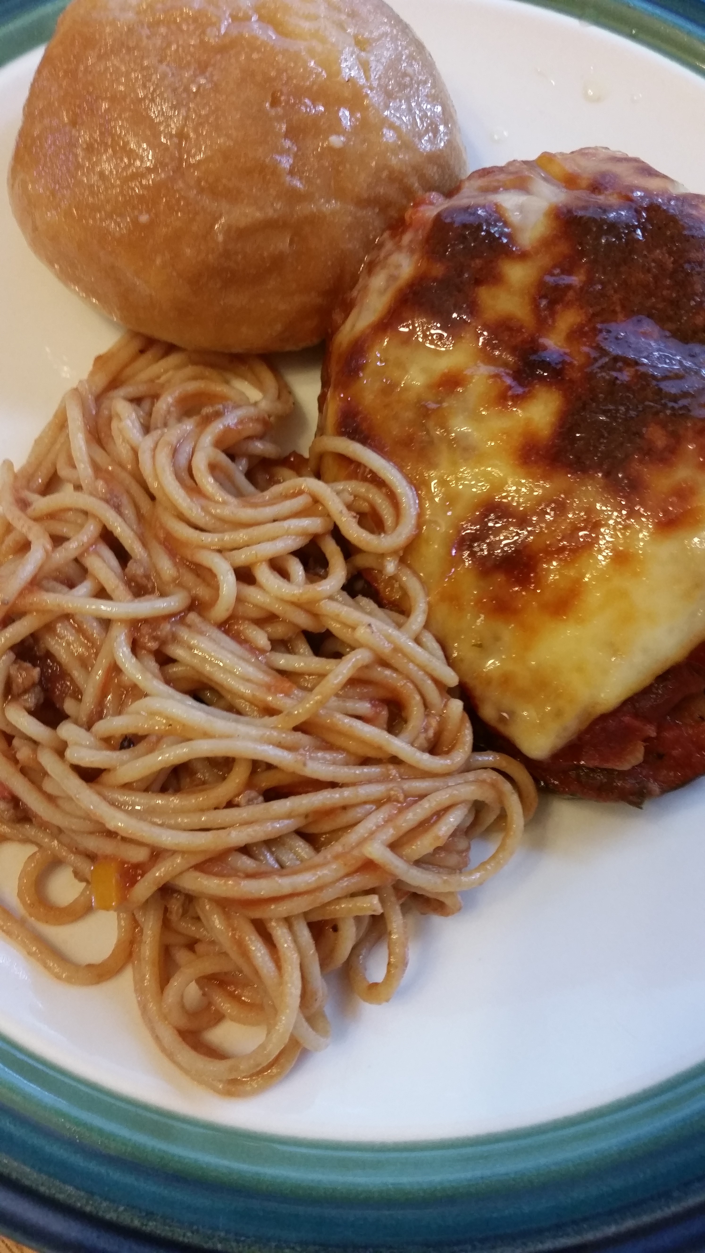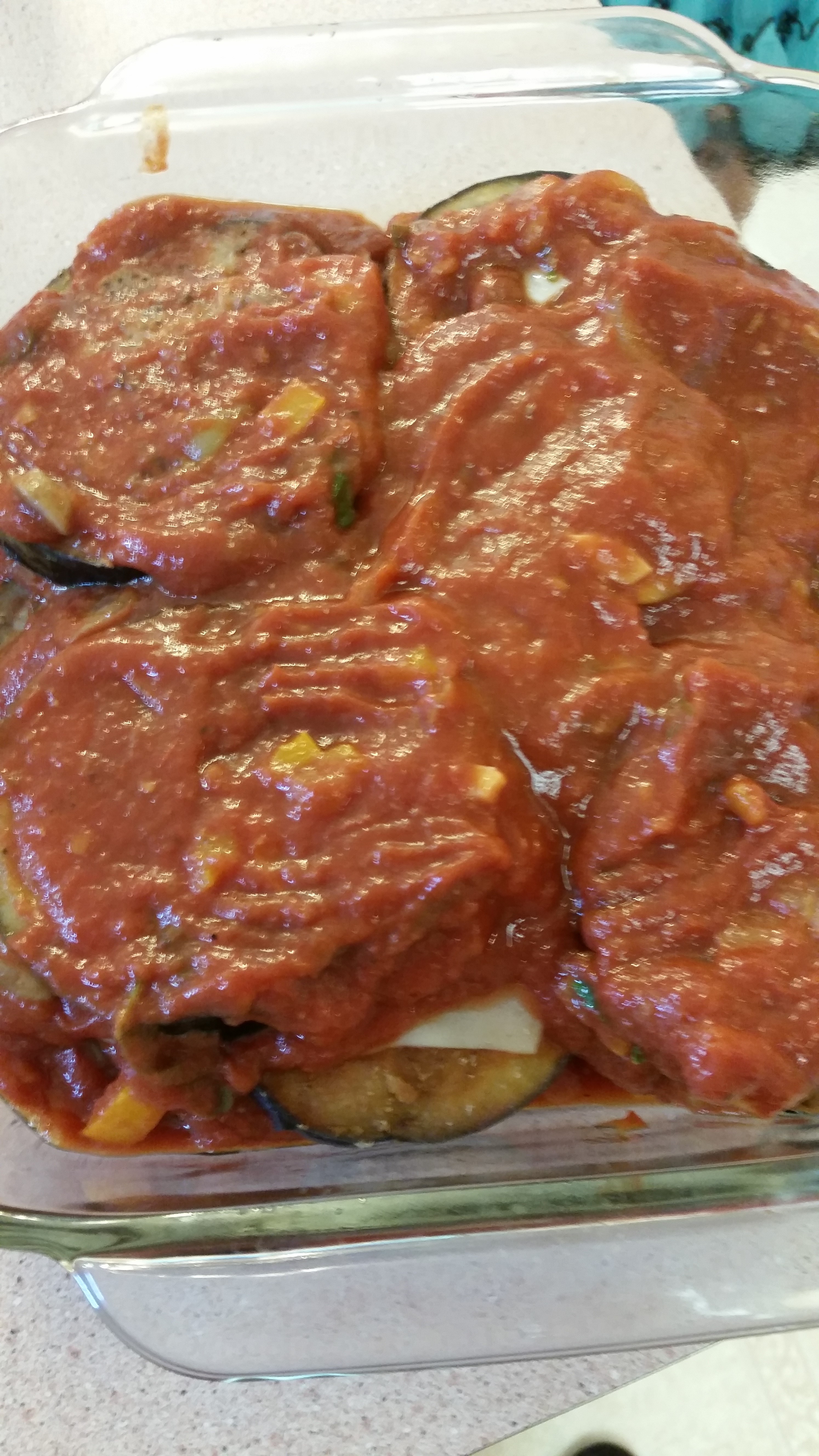 I am the only one who likes eggplant in this family, but that never stops me from making what I want! When I saw a beautiful eggplant at the store, I just had to get it. I made a small pan of eggplant parmesan lasagna- no noodles. I used the eggplant disks as the pasta; this recipe can serve 4. I had one, saved one for lunch tomorrow, and gave the rest to my awesome neighbor along with a bunch of leftover pasta. Oh, and those garlic butter rolls? So good!!!