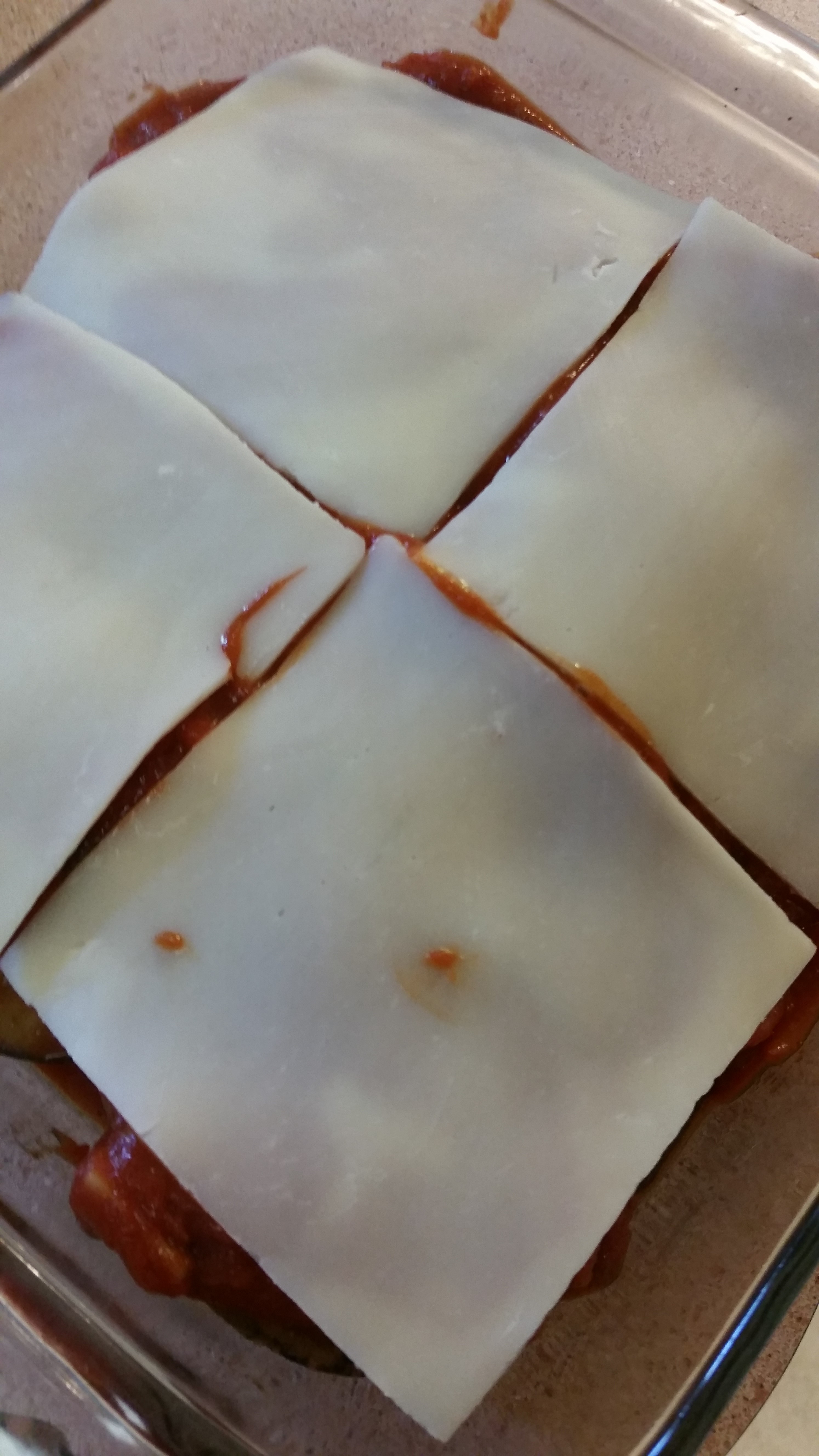 Put a bit of your marinara sauce on the bottom of a small corningware dish. Layer the eggplant (like noodles in lasagna), marinara, and mozzarella cheese. Bake at 300 for 30 minute. I turned it on broil the last 5 minutes or so to get my cheese to brown. SO GOOD!!!