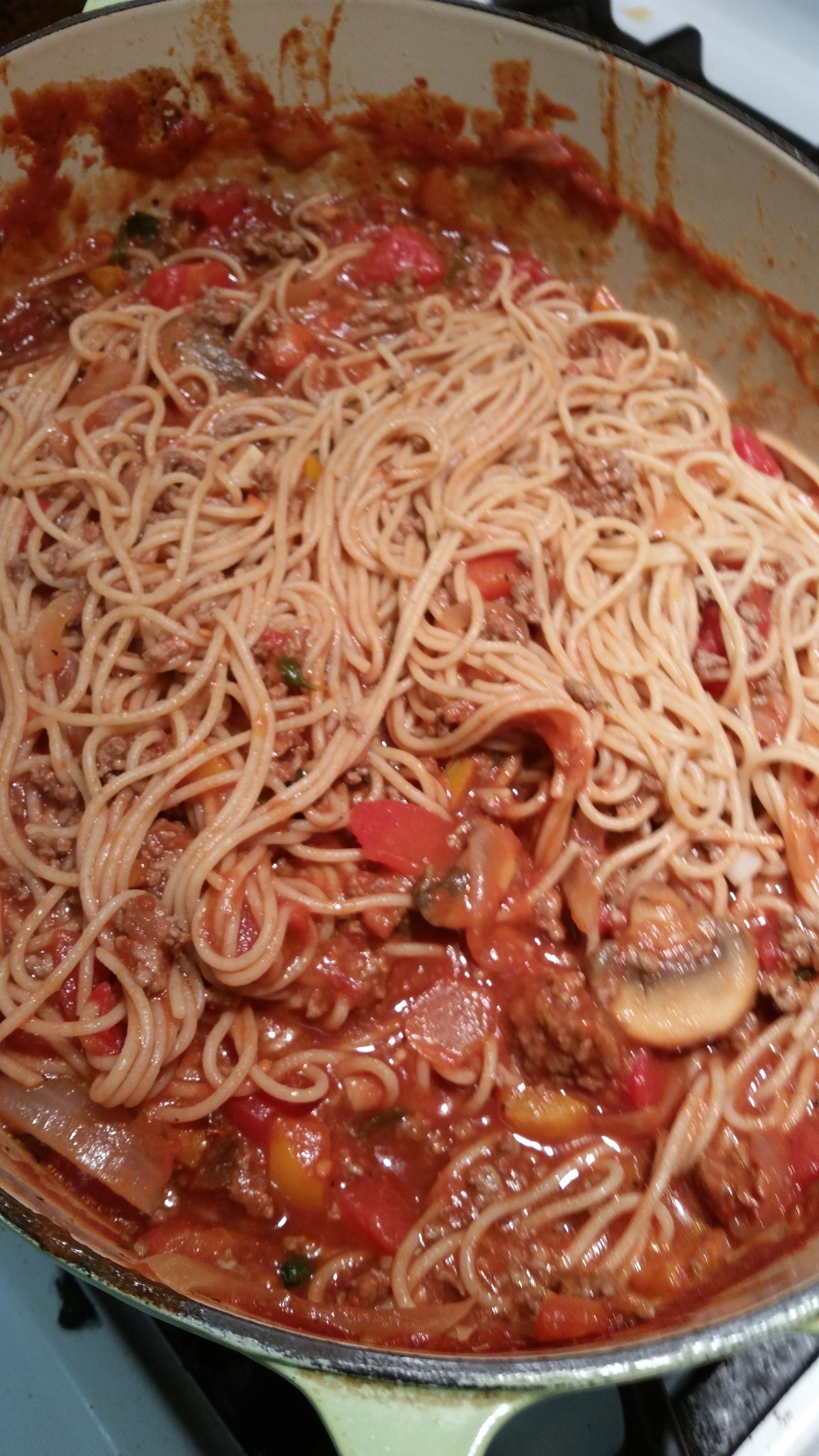 Dinner tonight was so fun to make. I love making different pasta sauces, and I adored this one. I decided at the last minute to add some sweet peppers to the mix; I love this addition to a marinara. It gives it an extra chunky and sweet component that added something different from the normal marinara.