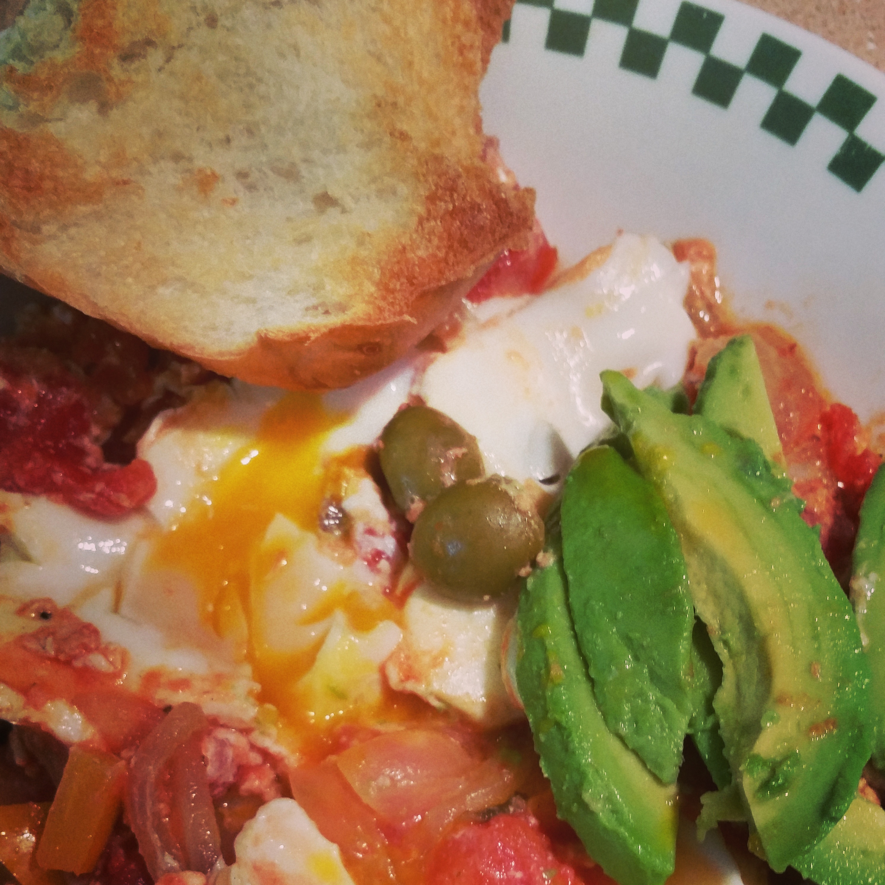 Using the back of a large spoon, make 2-4 dips in the sauce, then crack an egg into each one. Put a lid on the pan, then cook over a low heat for 6-8 mins, until the eggs are done to your liking. Top with sliced avocado and serve with crusty bread.