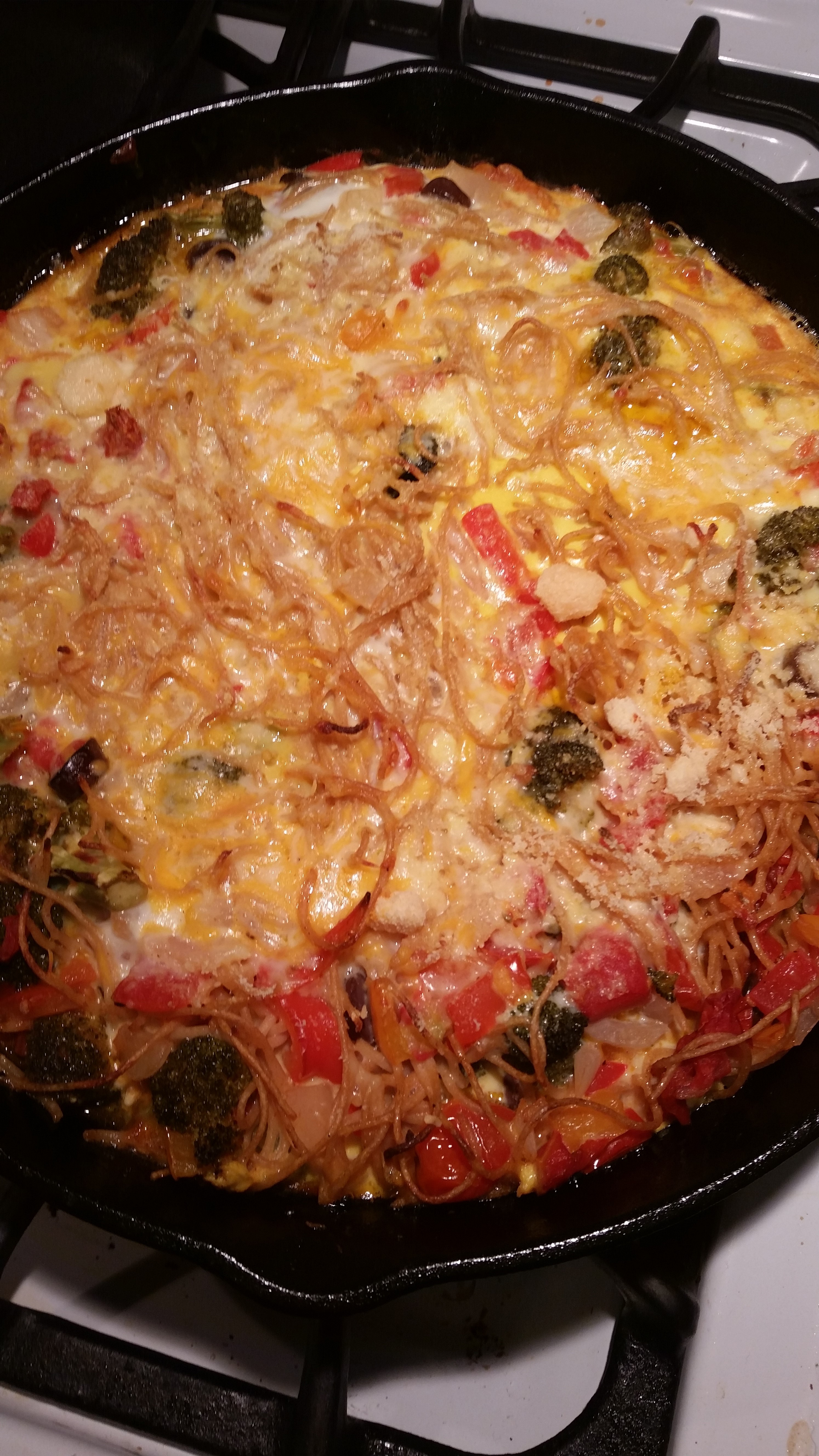 In a large cast iron skillet or oven safe dish, start warming your pasta and sauce. Whisk your eggs with some salt and pepper. Add them to the pasta. Stir around. Top with cheese. Let cook for 5 minutes or so. Put the pan in a 375 oven and bake for 25 minutes or until your cheese turns golden brown. Set out of the oven and cool a bit. Great way to have pasta leftovers!