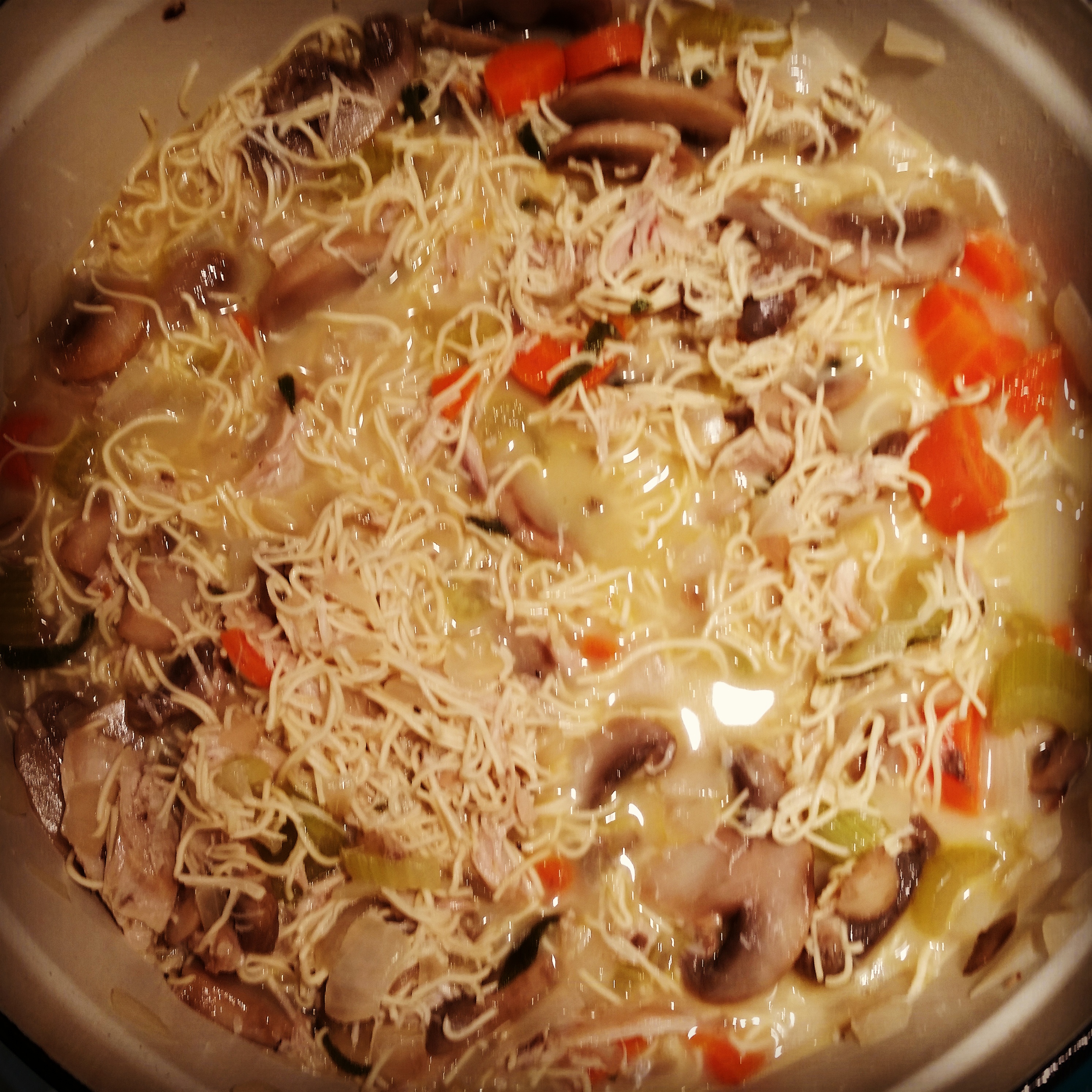 In a large pot, add the veggies in 3 tablespoons of melted butter. Then add the salt, pepper, thyme, and sage. Cook for about 10 minutes, stirring occasionally. Add your stock. Bring the mixture to a gentle boil, add in the chicken and noodles. Make sure the noodles are covered with the stock. Stir occasionally.