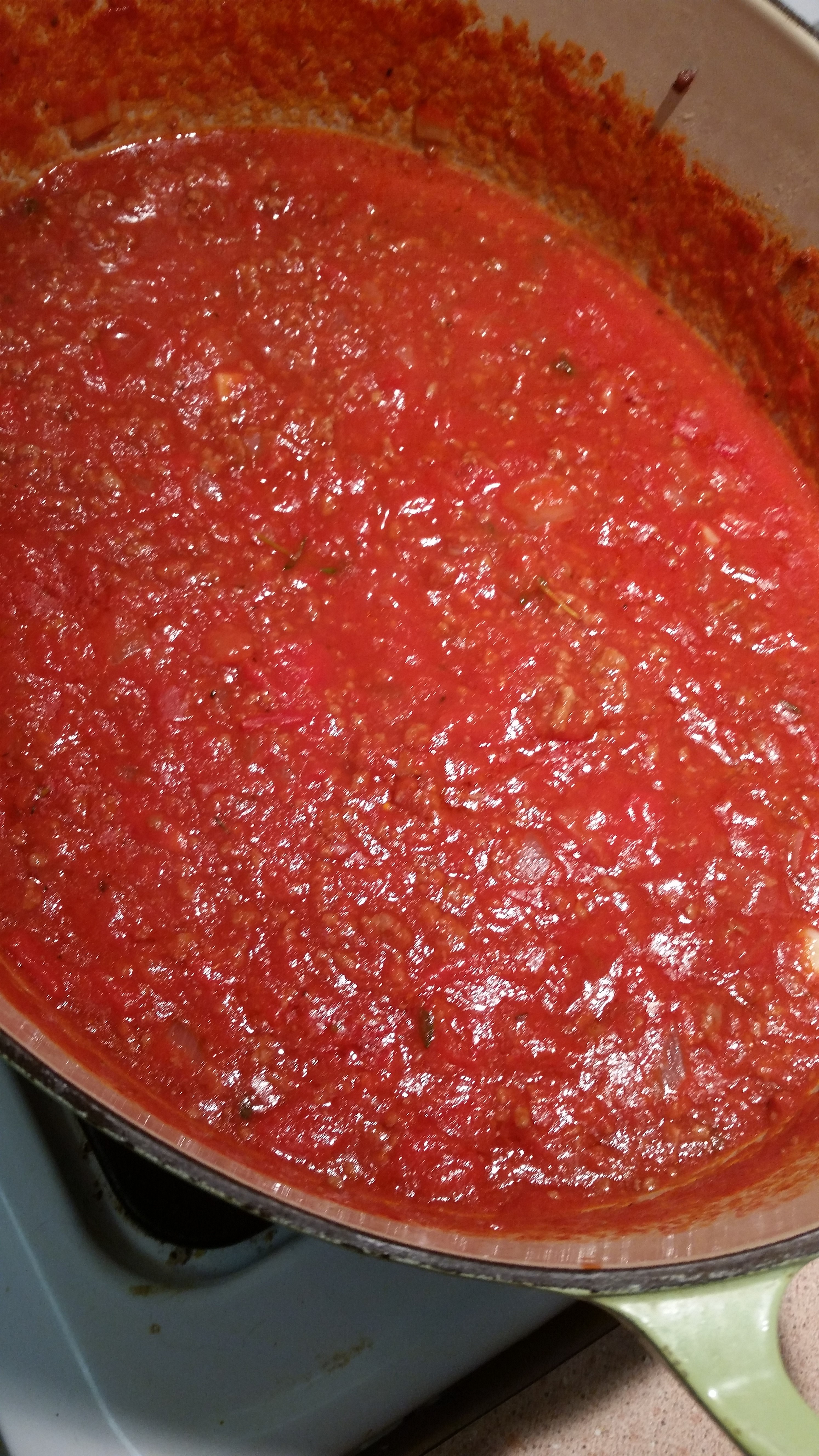 Brown your beef. If there is any grease, drain it. Add your onions. Cook down for 5 minutes. Add in your garlic and tomato paste. Cook down for 3-5 minutes. You can actually smell the tomatoes when they are mixed well with the garlic. The aroma is amazing. The beef and onions should be really camariling now. Add just a splash of red wine down in the pot to loosen up all those brown bits. Then add in all your canned tomatoes. Mix well. Add in your sugar, worcestershire sauce, butter, and thyme. Mix and simmer for at least 30 minutes. The longer the better.
