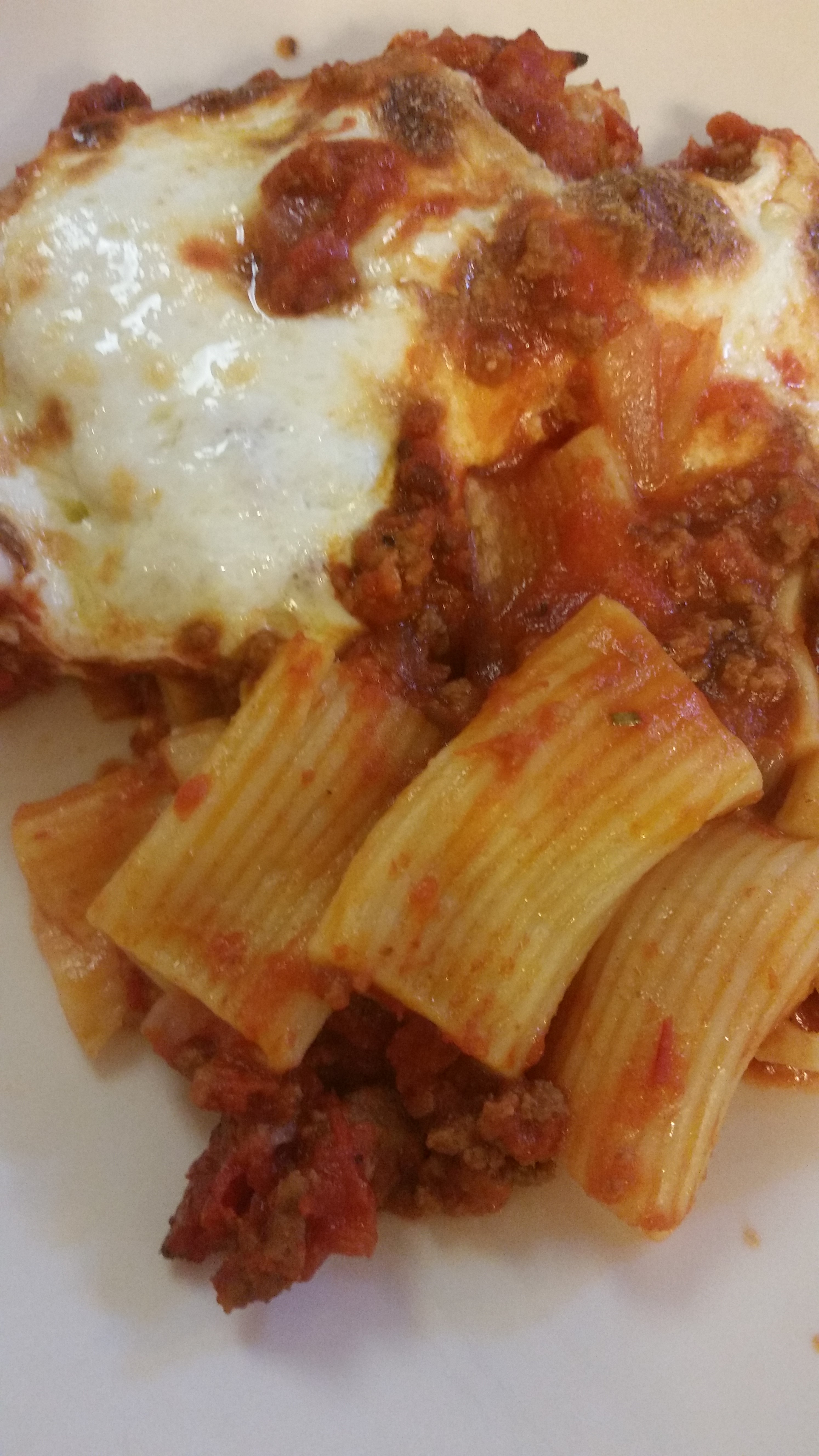 I thought…I meandered in the kitchen; I opened the pantry;I looked in the fridge; I looked in the freezer. I had an idea. I pulled out some ground beef from the freezer, found some canned tomatoes in the pantry, borrowed an onion from my awesome neighbor, poured a glass of wine, and I started to get my groove back in the kitchen. I gave Lizzie the choice of lasagna or baked ziti based in the noodle selection from my pantry. Well, she picked this. And I gladly obliged.