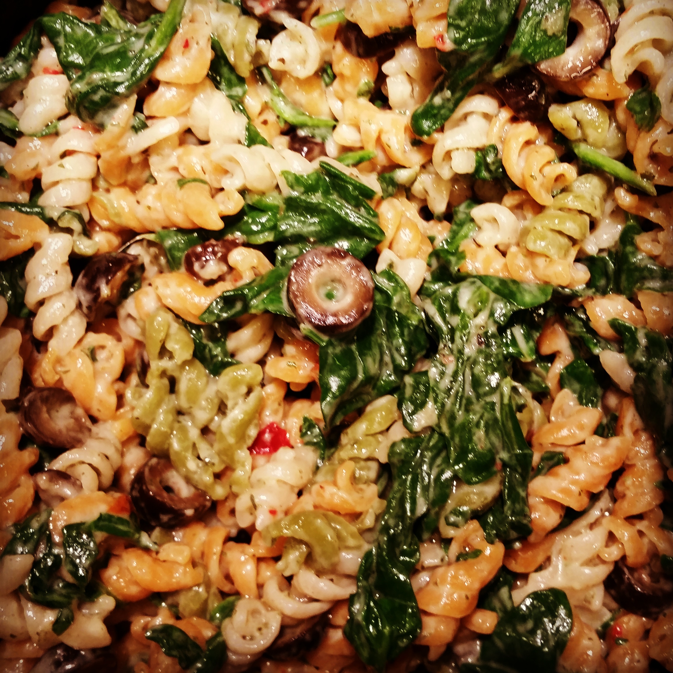 Pasta Salad with Chicken, Spinach, Feta, and Black Olives