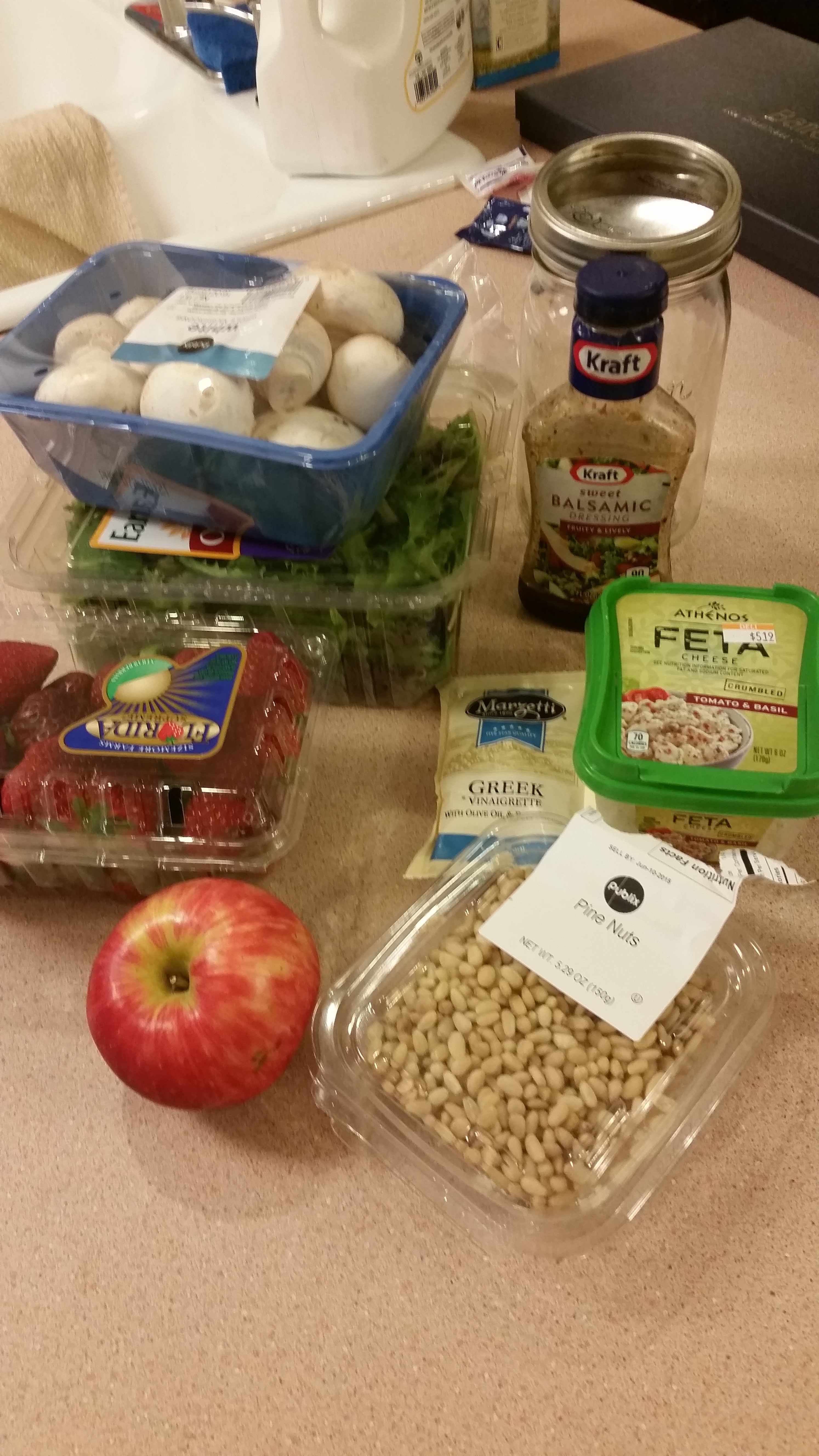 2 containers- Balsamic and Greek Dressing combined…feta, cucumbers, lettuce, tomatoes, strawberries, apple slices, pine nuts, mushrooms.