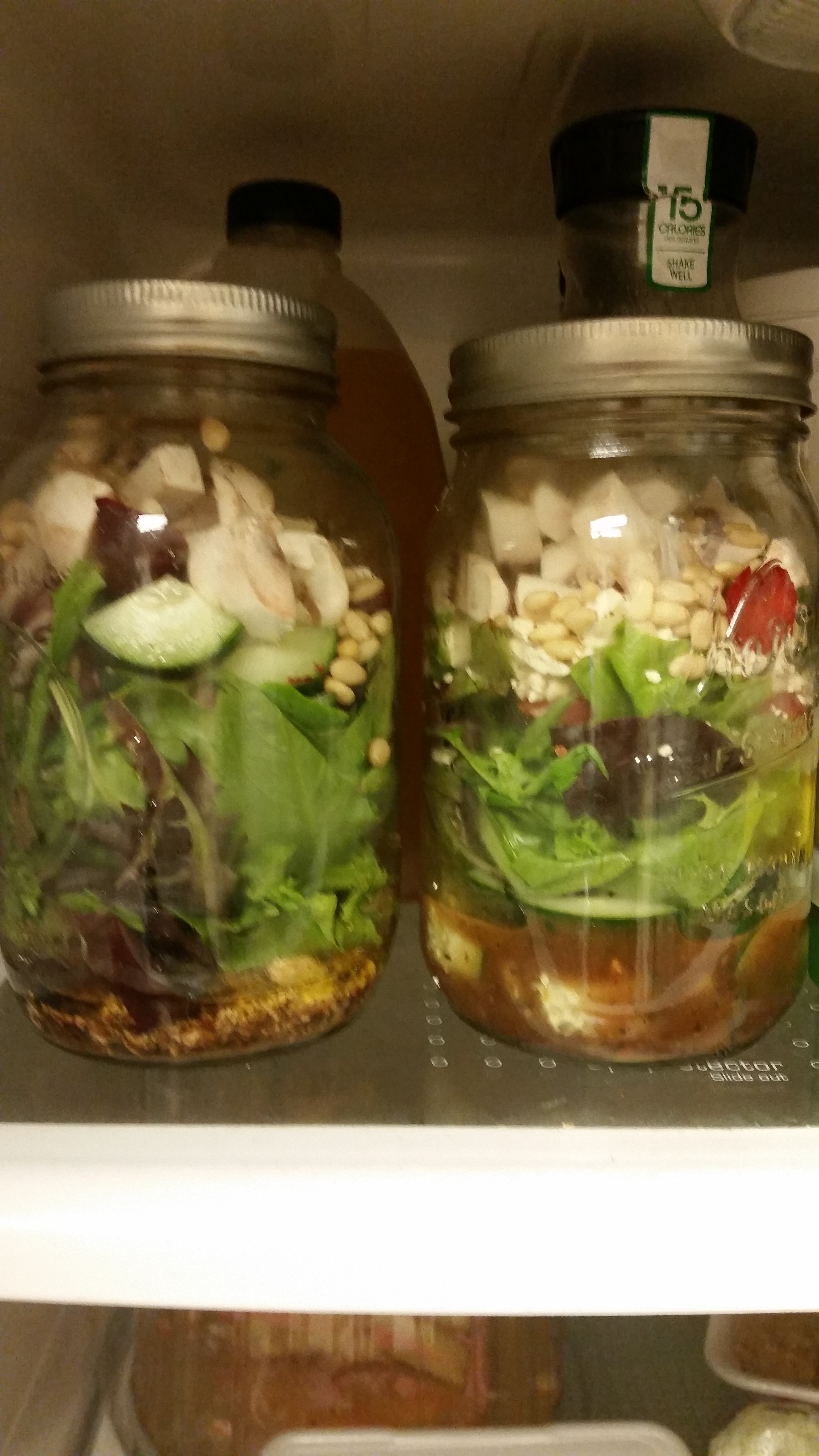 Random fridge ingredients that can be used in a salad…dressing on the bottom, heartier ingredients on the bottom and delicate ingredients on the top. Still trying to figure this out. I am doing a different combo each time depending on the ingredients. No mixing until lunchtime! Shake right in the container!
