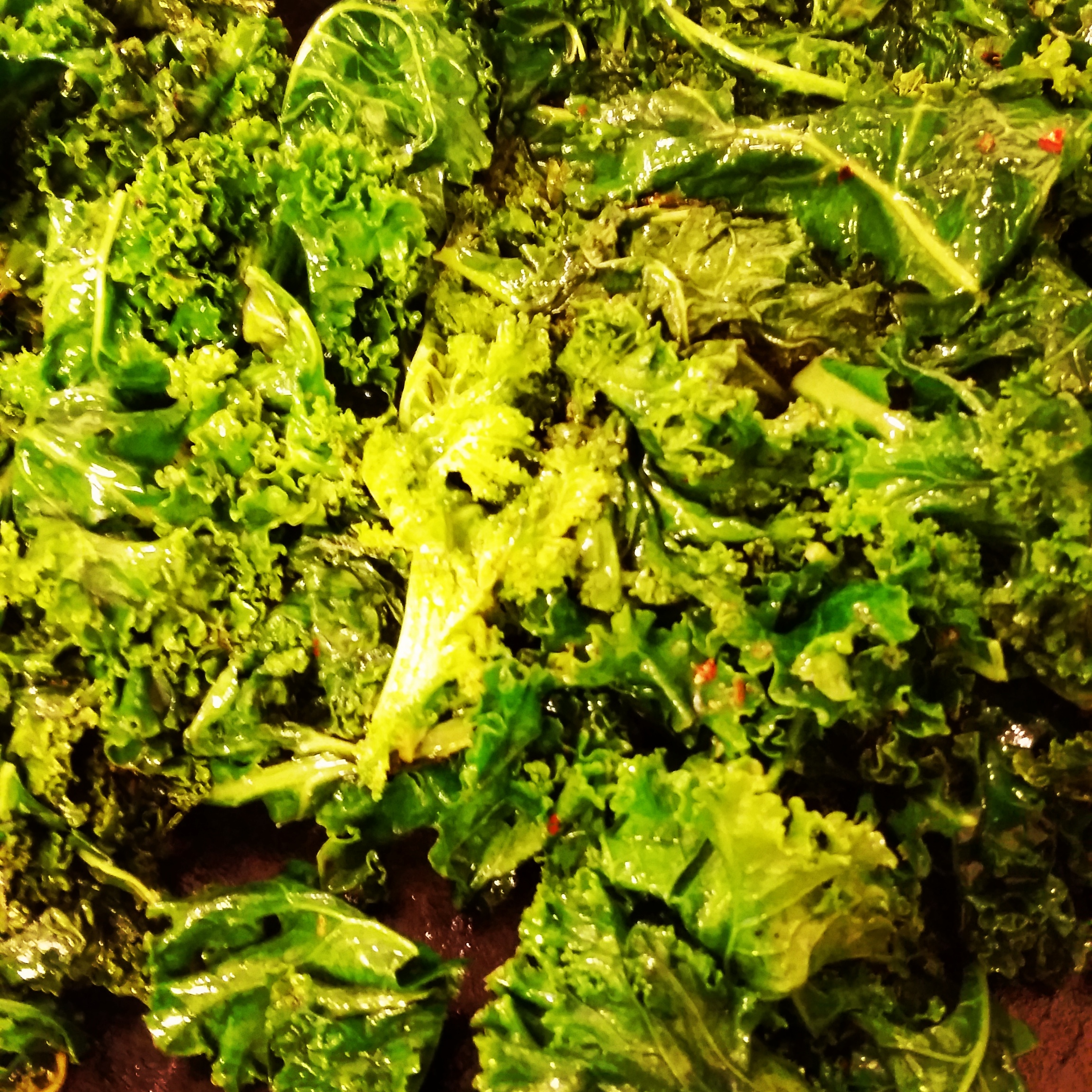 Take a few large handfuls of kale. Pull of stem and chop. Add to a few tablespoons of olive oil and cook down with about a teaspoon or so of each salt, pepper, and red pepper flakes. Spicy and a bit crunchy. Love!
