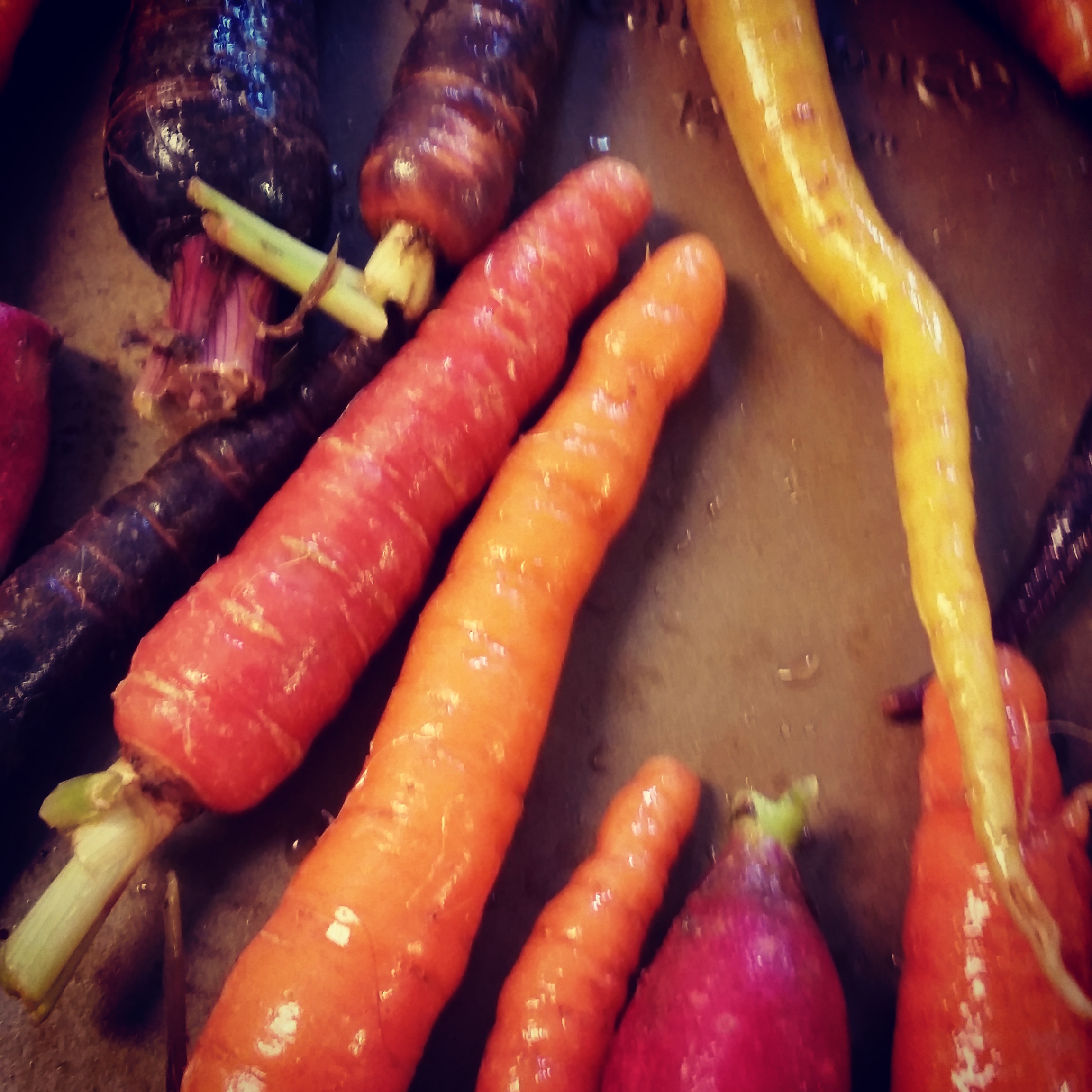 Cut the stems and roots off cleaned carrots and radishes. Add to cookie sheet and coat with olive oil, salt, and pepper. Roast for 20 minutes on 425 or until veggies are fork tender.