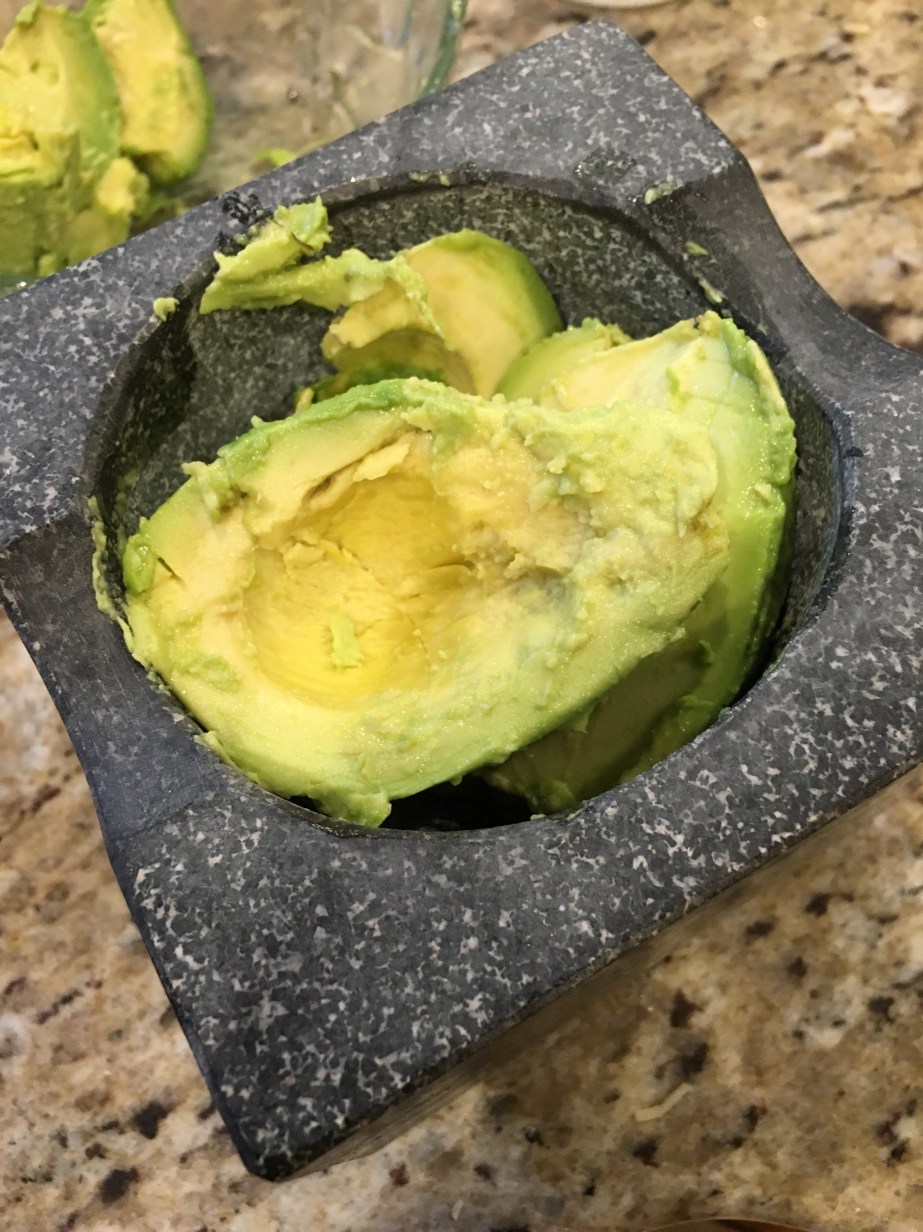 The start… 2 avocados, salt, pepper, juice of 1 lime, and a tablespoon of queso fresco diced and stirred in.