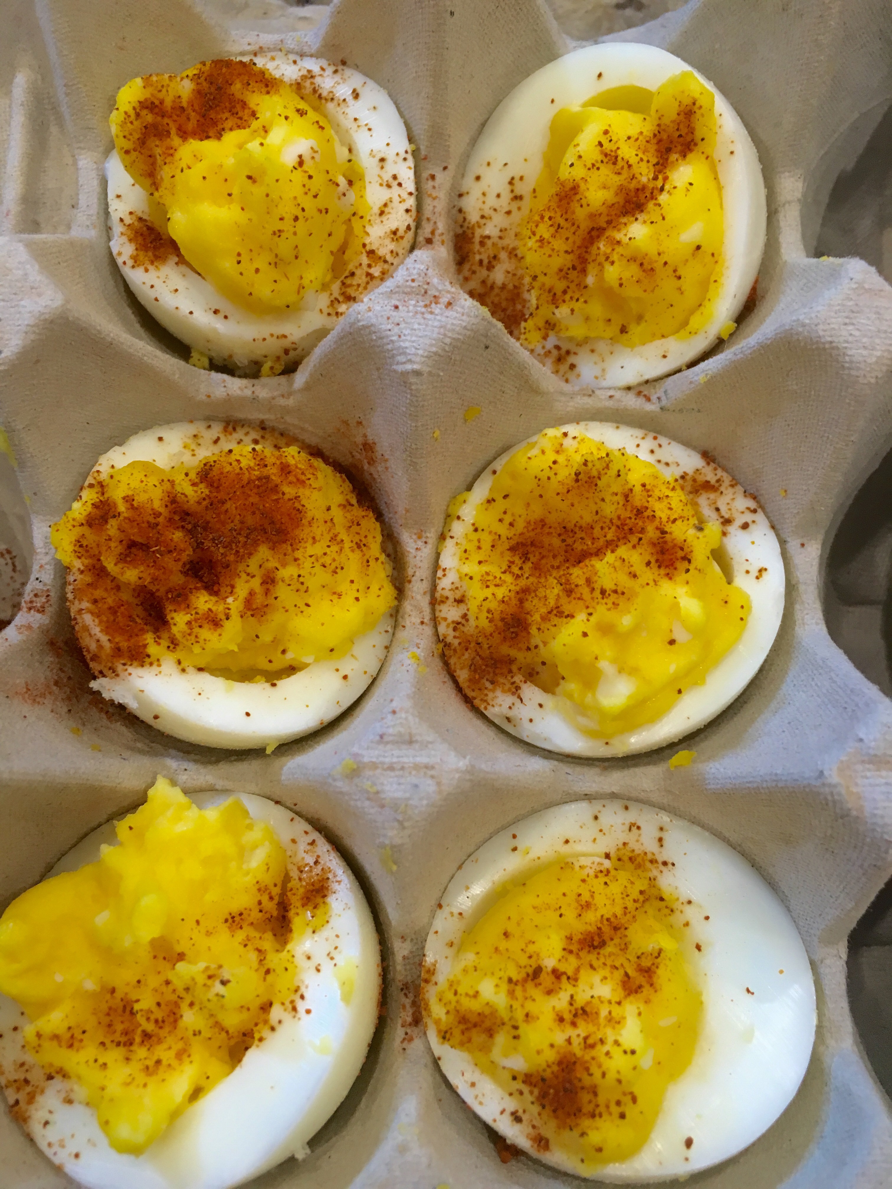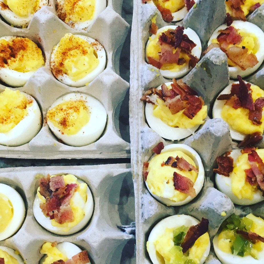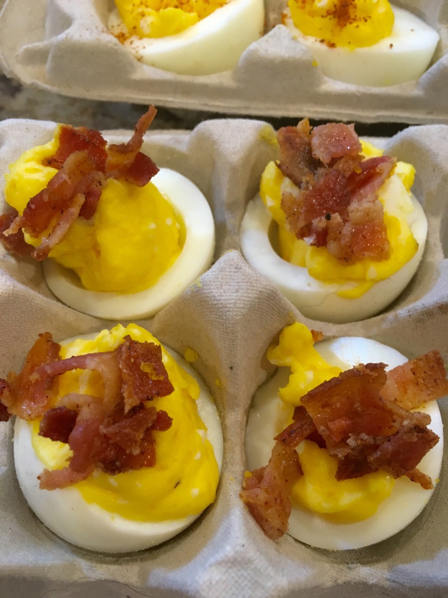 I took all of the yolks out and put them in a bowl. I also chopped one whole egg and added it to the mix. Then I slowly added in some mayo and whipped until I got a nice creamy mixture. I put the deviled egg mix in to a zip top baggie and sniped the end. Once they were all filled, I topped most with chopped bacon, a few with just paprika, and a couple with sweet relish and bacon. They were pretty amazing, if I do say so myself.