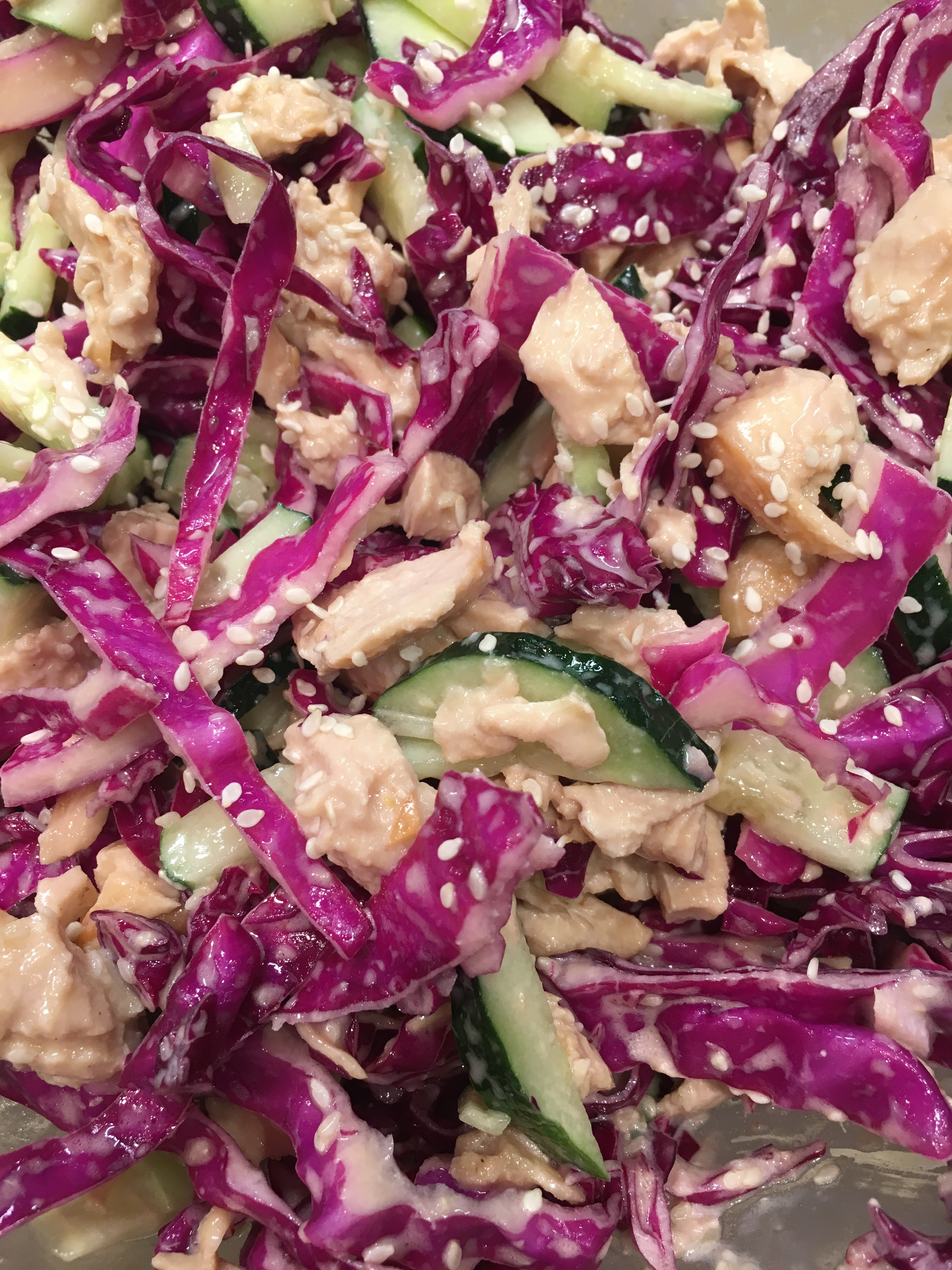 I made this salad out of all the leftovers…Shredded Purple Cabbage, chicken cut in to bite-sized pieces, thinly sliced cucumbers, sesame seeds, and a lovely sesame dressing (1 tablespoon miso, 1 tablespoon apple cider vinegar, 1 tablespoon sesame oil, and 1 tablespoon mayo. Add a good pinch of salt and pepper, and you have yourself a delightful summer salad! Taking this for lunch tomorrow!