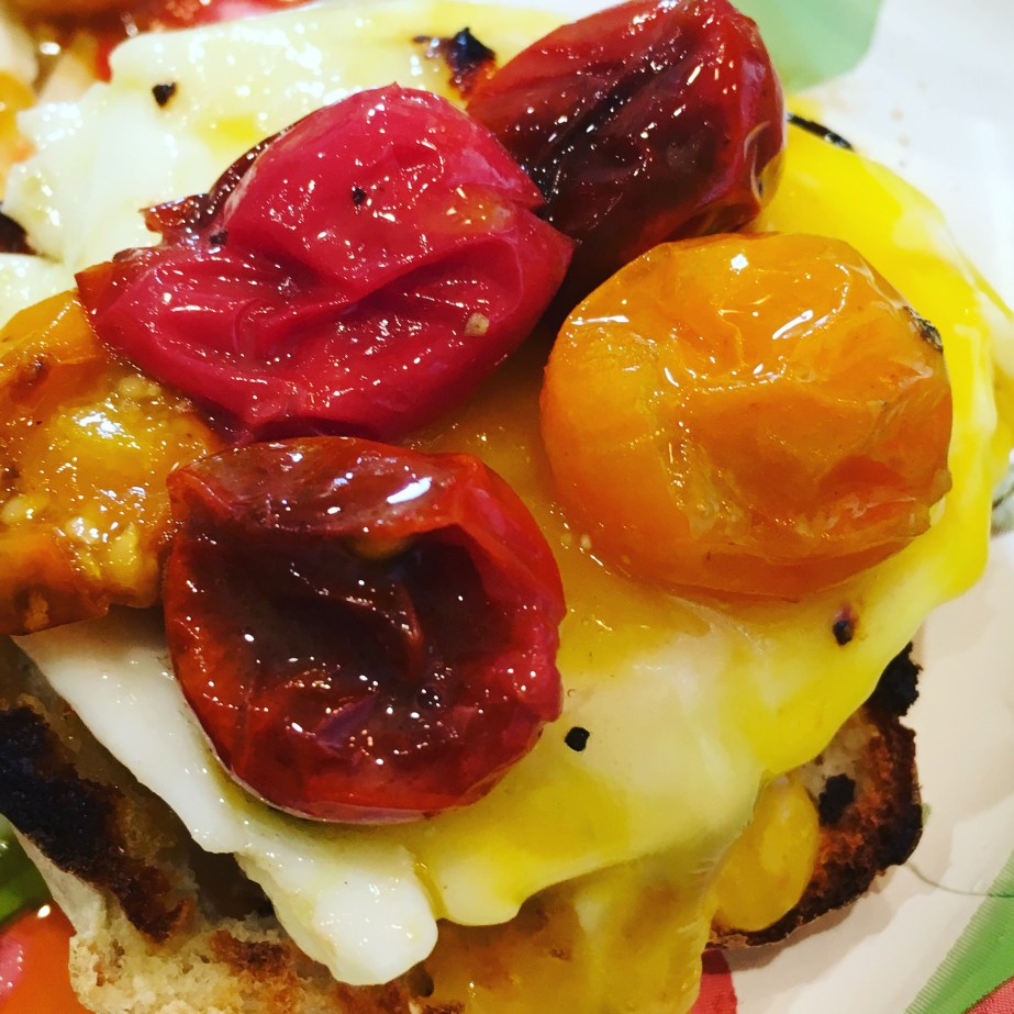 I got some amazing tomatoes this week at the farmer’s market. I mean…July is the BEST for tomatoes! I took a couple of handfuls of those beauties and cooked them in a bit of olive oil with a good pinch of salt and pepper. I covered them with a lid and just let those babies pop and char for a good 5 minutes. I toasted some English muffins and made my sunny side up eggs.