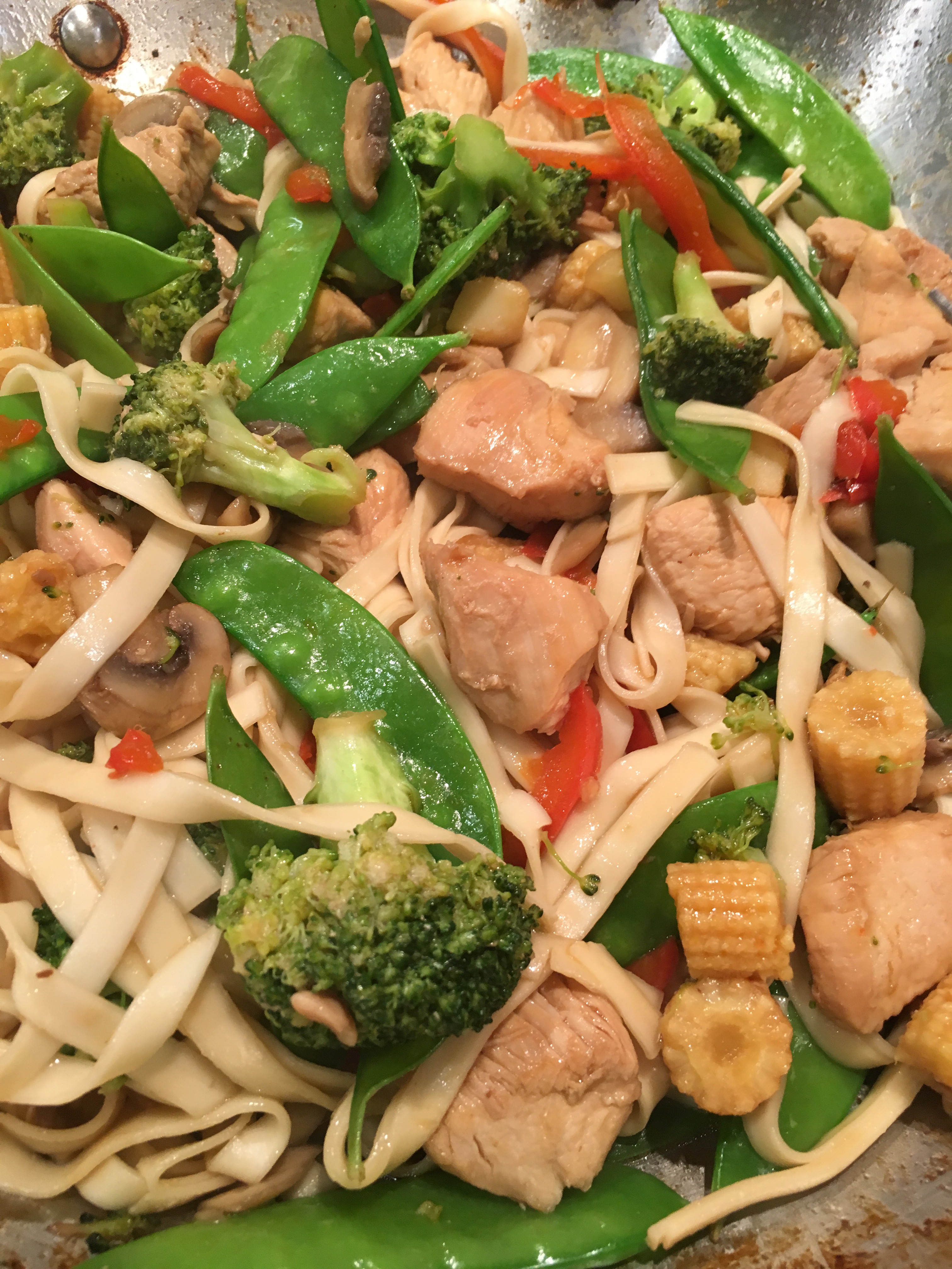 Sunday, I made some chicken stir fry kinda like this. The noodles were not the same, but everything else pretty much was. You could also use rice instead of noodles.