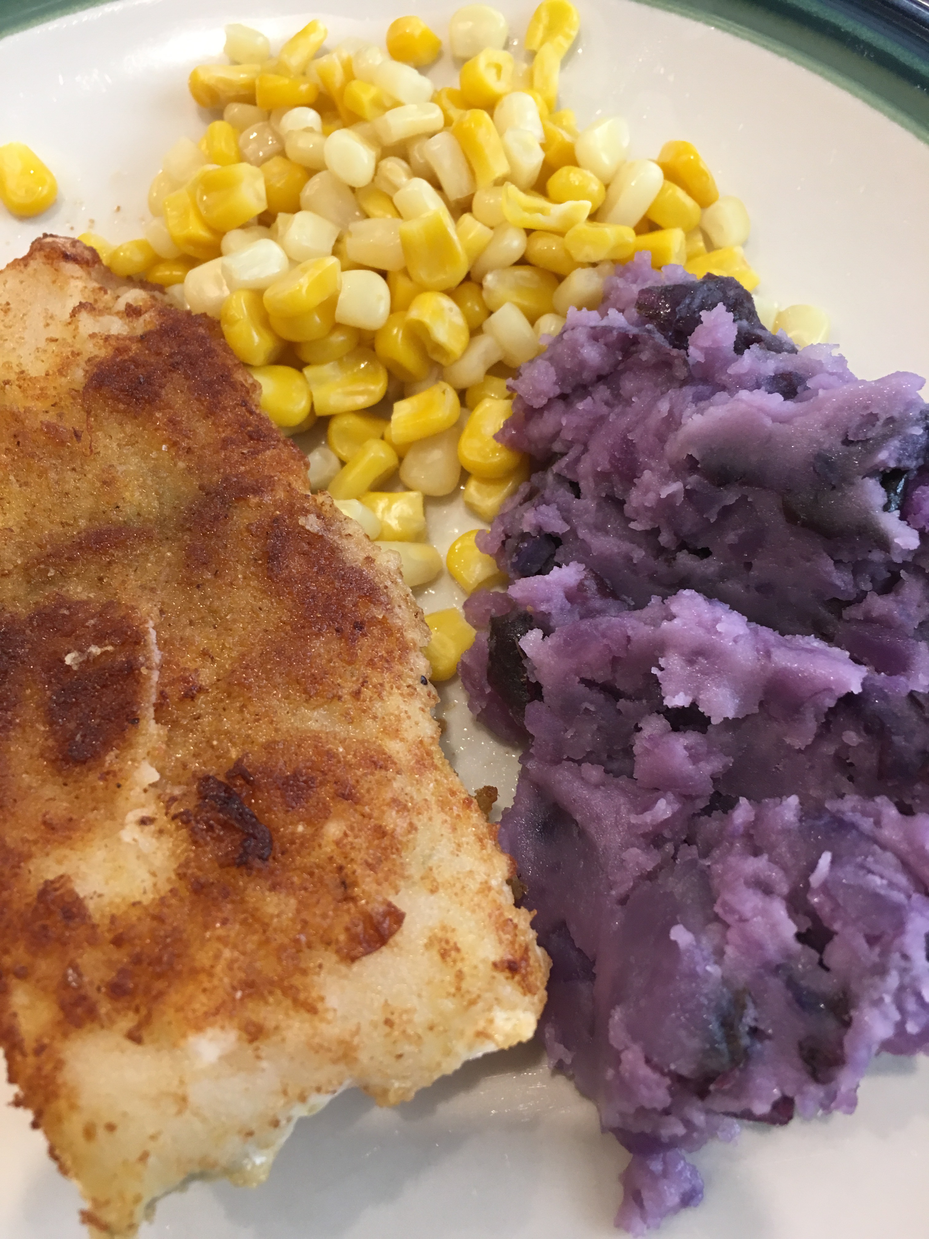 The fish was treated with the standard breading procedure- FEB- Flour, Egg, and Breadcrumbs with seasoning (salt, pepper,Old Bay- my addition) and cooked on each side for about 3 minutes in a bit of olive oil.