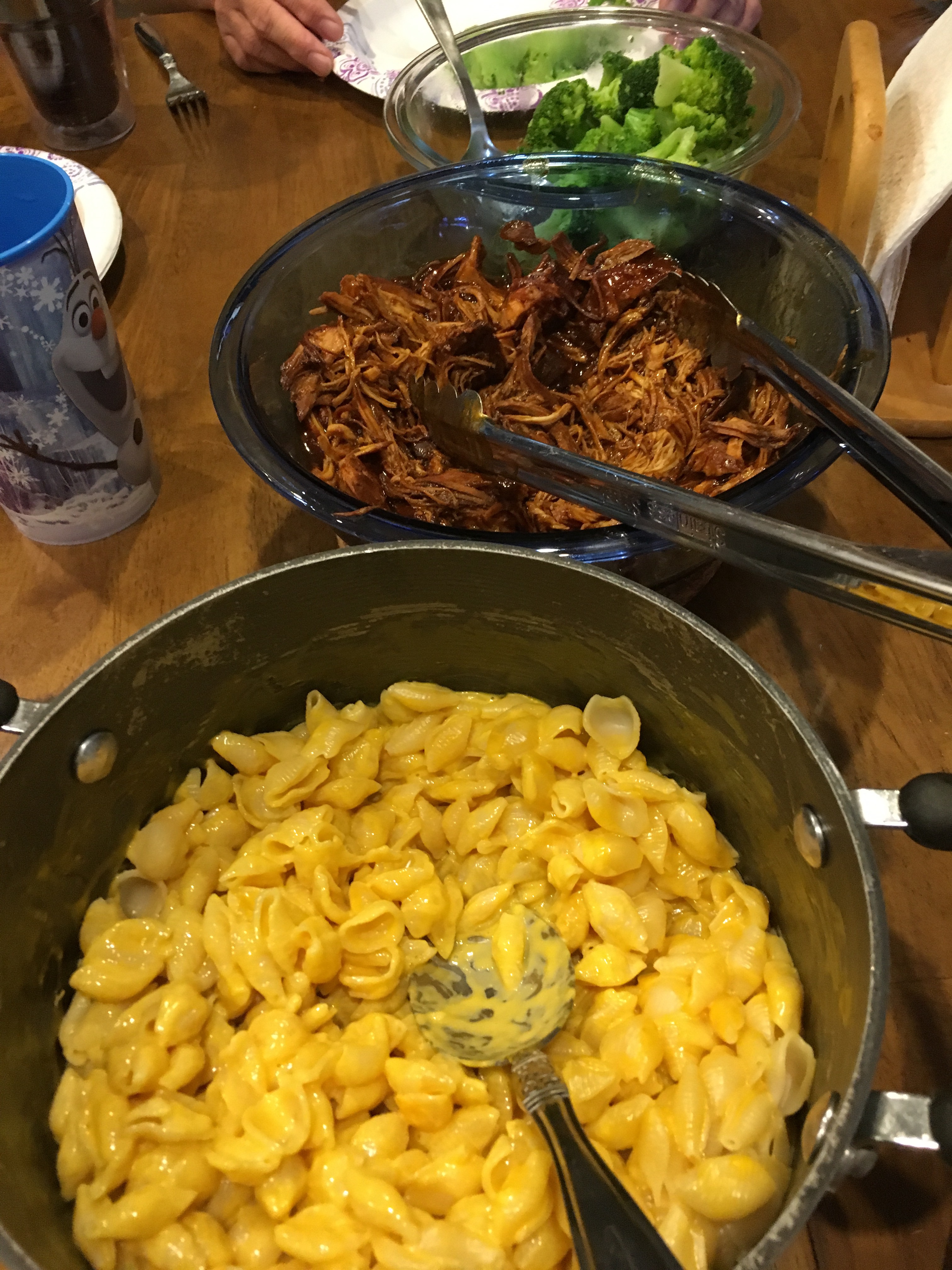 Hey guys! I made this meal last night for the family. It was so easy. All I did was put six chicken breasts in the crockpot with a bottle of barbecue sauce. I added some salt, pepper, and onion powder. I cooked it on low all day long, and when I got home from work, dinner was almost ready. All I had to do was shred the chicken. We put it on buns and made BBQ sandwiches. I served with a side of mac & cheese and broccoli.