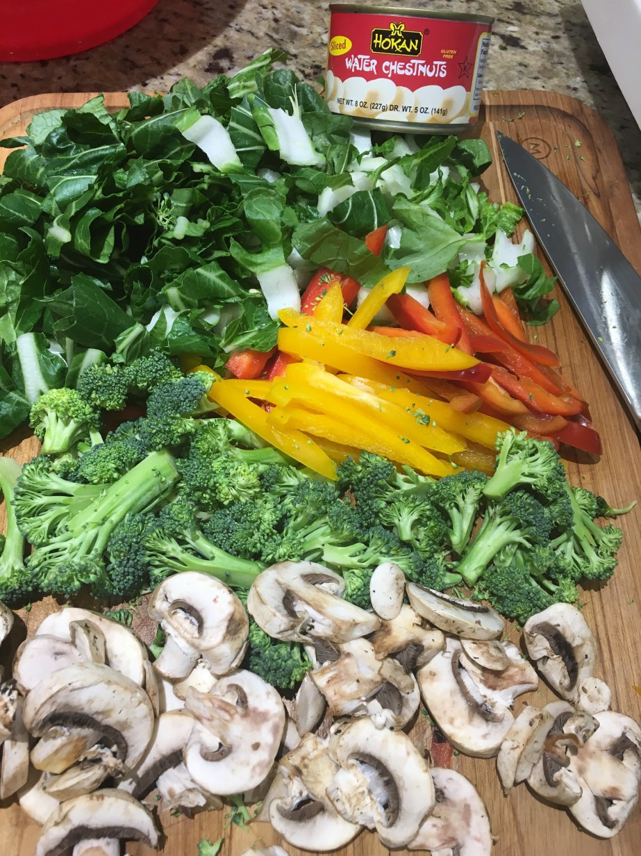 I chopped and cut up a variety of veggies- bok choy, broccoli, mushrooms, sweet peppers, and water chestnuts (other options- snap peas, bamboo shoots, baby corn etc.)