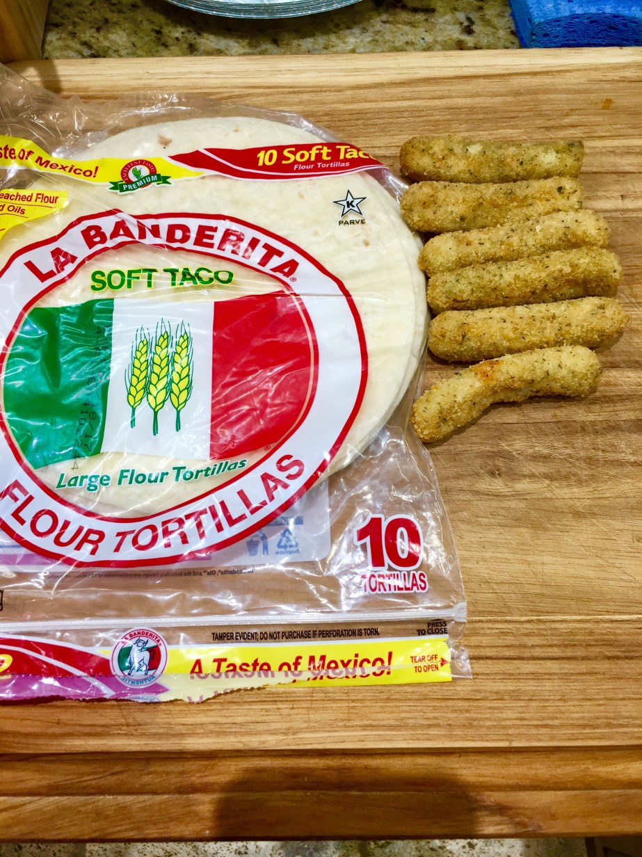 Introducing the cheese stick quesadilla. It tastes like you think, and you are welcome. You could either dip it in left over pizza sauce or sour cream. I tried both and they pass the test.