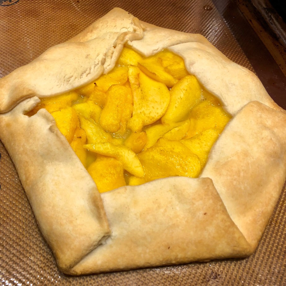Super ripe peaches peeled, sliced, and placed in a pie crust, free formed. Brushed with melted better, sprinkled with a bit of sugar, and baked at 400 for about 20 minutes. Served with vanilla ice cream and whipped cream.