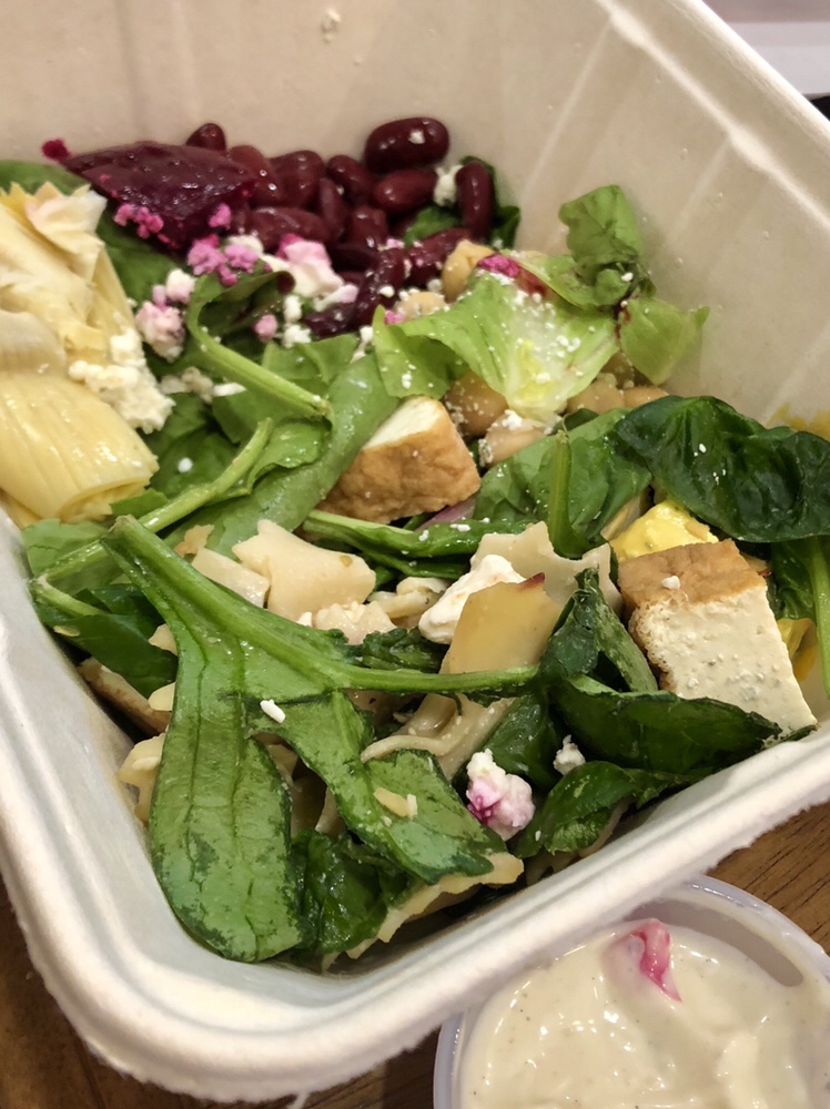 Spinach and Romaine, tofu, beets, kidney beans, artichokes, chickpeas, pasta, and blue cheese and feta.
