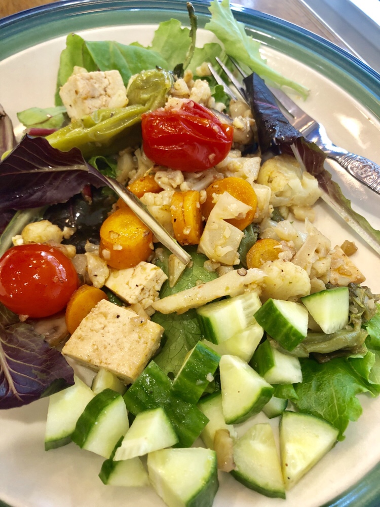 I cut my cauliflower in small pieces (some ended up like “rice”), sliced a few mushrooms and carrots, and left the peppers and tomatoes whole. I stir fried them all in a few tablespoons of vegetable oil, sesame oil, hoisin sauce, and teriyaki sauce until they were tender. In the end tossed some cooked chopped tofu. I added half of a chopped cucumber and lettuce for some fresh elements, but it would have been just as good without it.