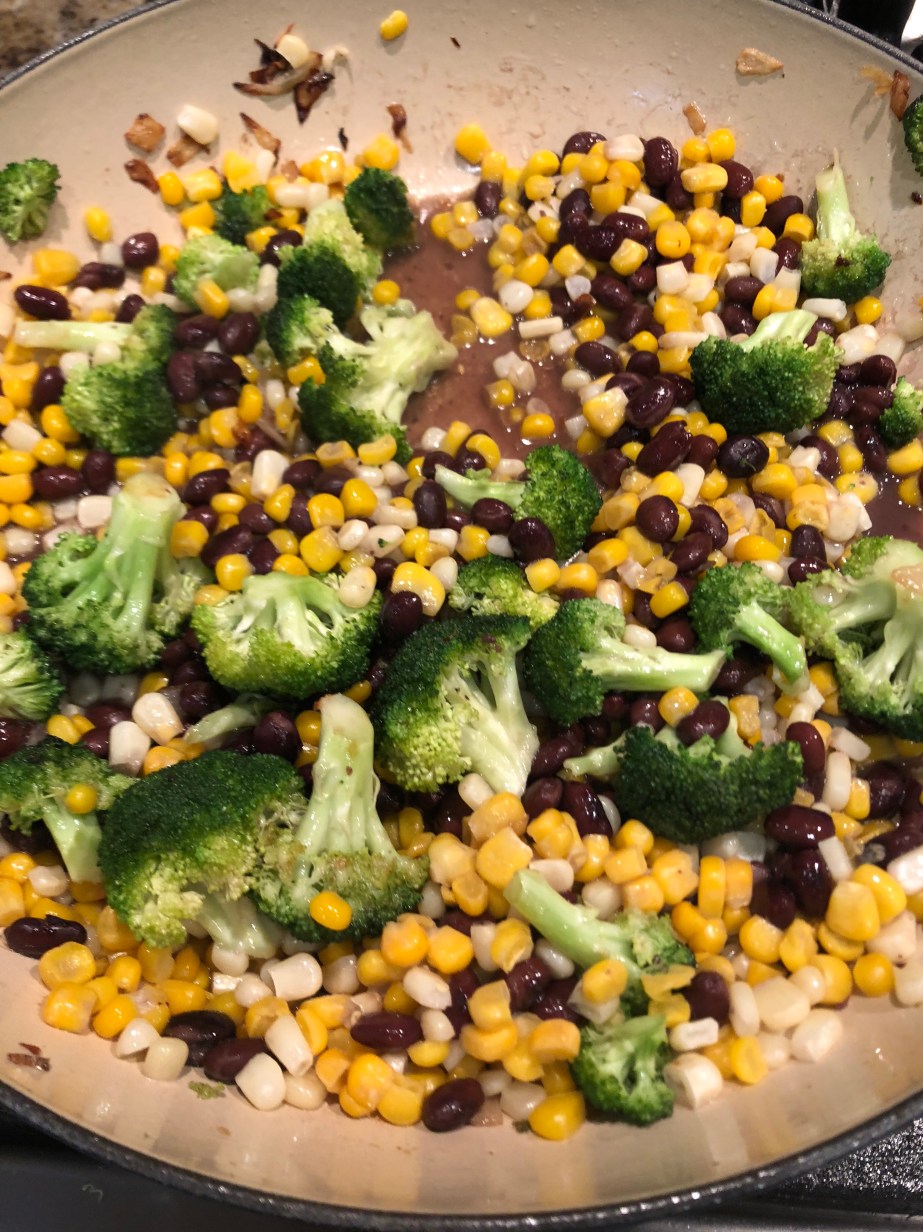 Then the veggies… saute an onion in olive oil, cut up a stalk of broccoli and cook until tender, throw in some canned black beans, and some frozen corn…