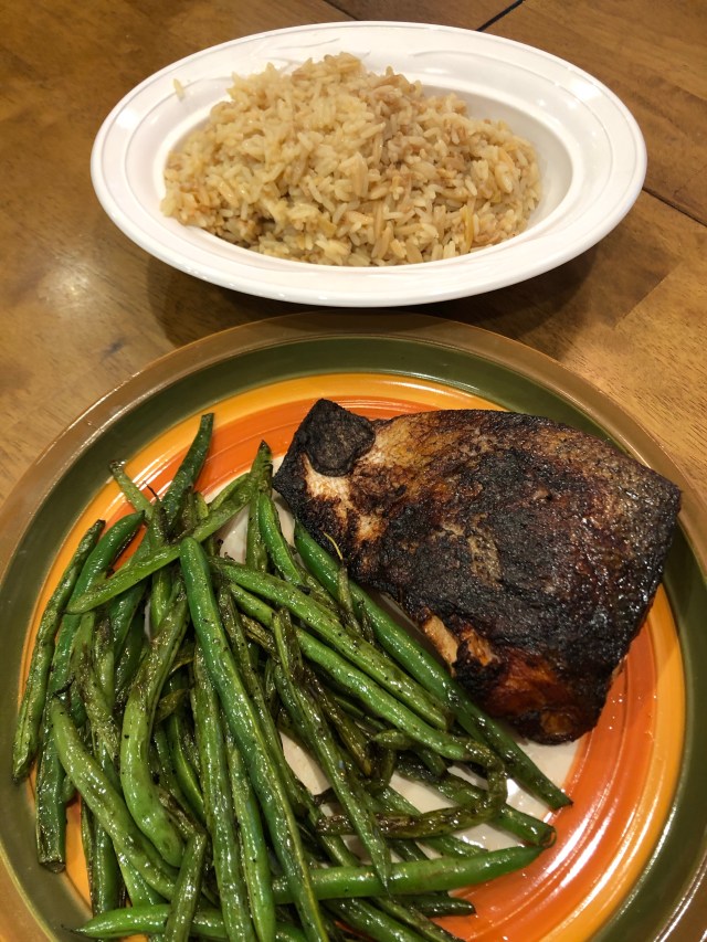 Sesame oil and garlic paste are potent, but this marinade is both for the fish and green beans. I added pepper, but NO salt.