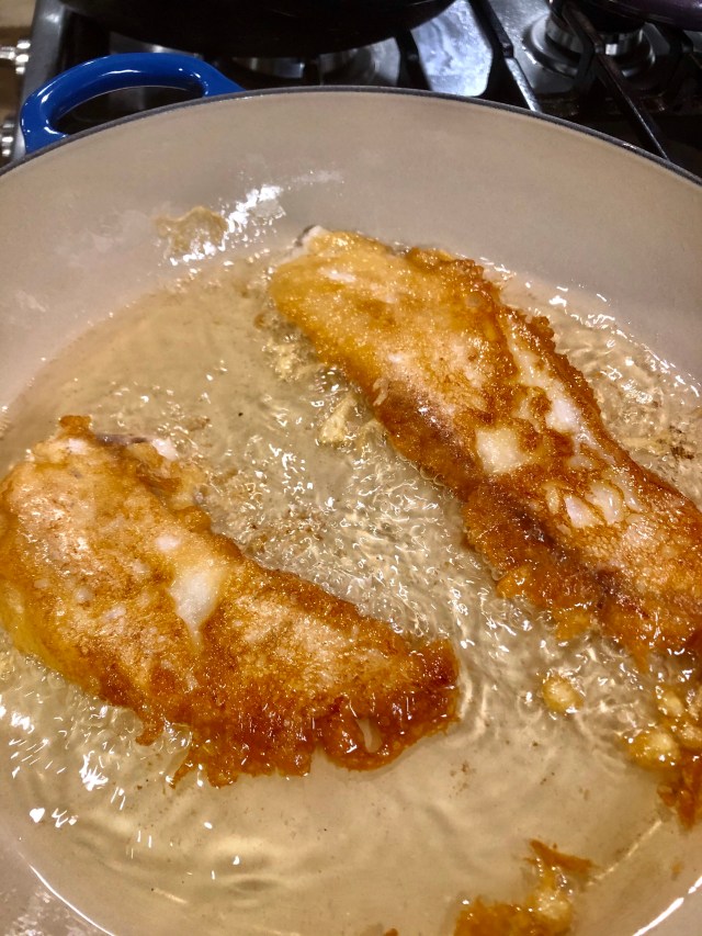I fried the fish about 3-4 minutes on each side. Just slide your spatula gently under the fish. If it does not come up easily, it is not ready. I only cooked 2 pieces at a time. DO NOT CROWD THE PAN!