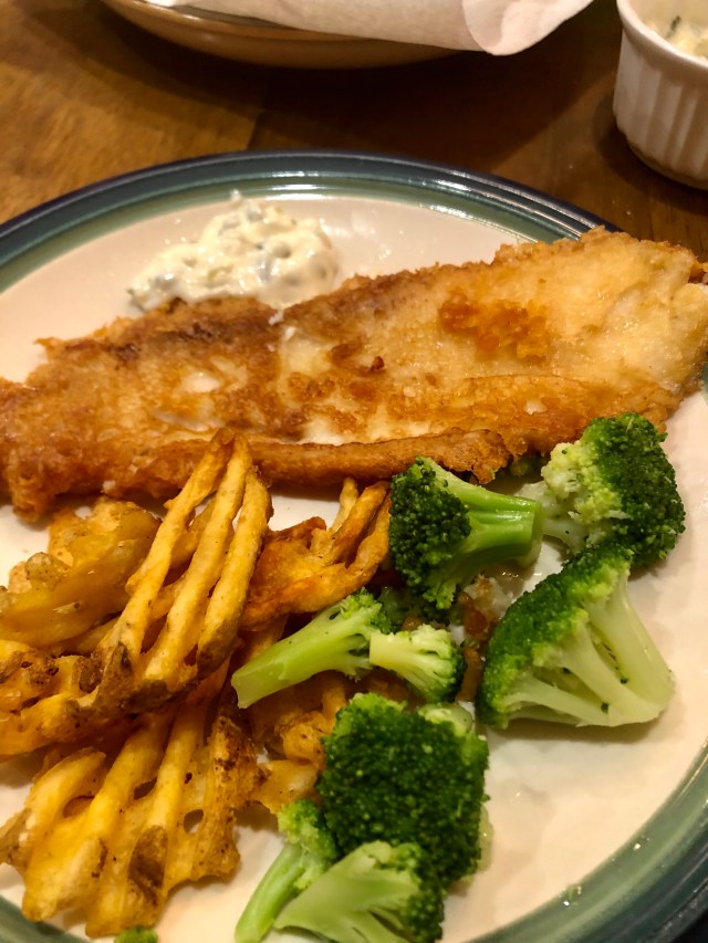 When they were finished, I put them on a plate lined with paper towels and hit them with a touch more salt. I served with fries and broccoli. I also made a quick tarter sauce with 1 cup mayo, a couple of tablespoons of pickle relish, and salt and pepper to taste. It was crunchy and flaky, just like fried fish should be!
