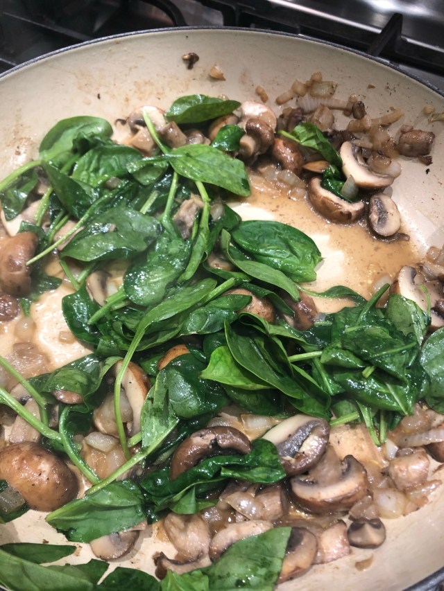 Chopped up the onion and rough chopped the mushrooms. Cooked them down in two tablespoons of both oil and butter, about 10 minutes. 4 tablespoons of fat. You could even add bacon fat and add bacon to this, but that is not the direction I went. You can play with any recipe once you see how to work the ingredients. Then add the spinach to wilt. Add salt and pepper to taste.