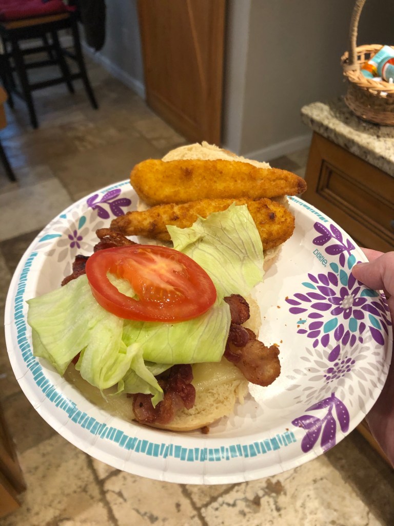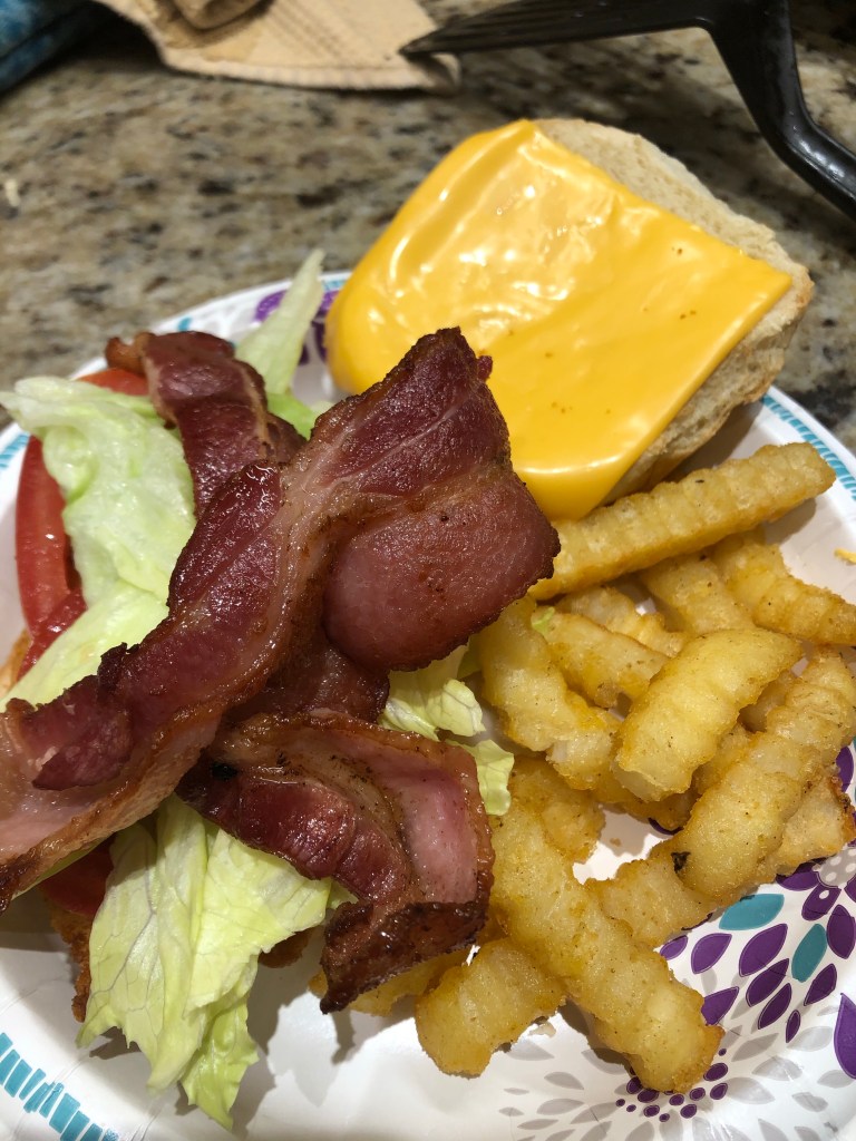 The hubby and Rebecca love their American cheese. Katie and I love it, too, but mostly for grilled cheese and patty melts 😉 I put extra salt and pepper on those fries. I toasted the buns with the cheese on top in the toaster oven. Katie and I are a sucker for Swiss. What a great sandwich.