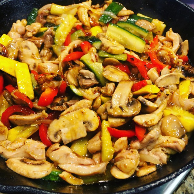 I used a pre-made fajita spice mix. NBD. I split the mix up with the chicken (5 thighs that I sliced in strips) and the veggies (1/3 onion , 1 red pepper, 1 container of sliced mushrooms, 1 small yellow squash, and 1 small zucchini). I cooked both in different cast iron pans to get a nice char on them, them added them all together at the end once they were both cooked, about 15 minutes.