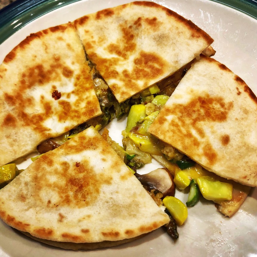 I like to treat my quesadillas just like grilled cheese, so I buttered one side of 2 small tortillas. I sprayed cooking oil to a non-stick skillet and heated the pan on medium high. Then I added the veggie mixture to the first tortilla and placed it buttered side down. Then I added a nice handful of shredded Mexican cheese blend. I added the top hat tortilla butter side up. I peeked at the bottom with my spatula and when it was brown and crispy, 3-4 minutes, I carefully flipped it. Same time on the other side, plus all that glorious cheese will be melting. Nothing better that this…