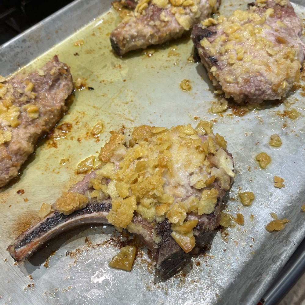 So easy. I coated the porkchops (bone-in) in vegetable oil. I crushed up saltines in a bag and added a pork chop at a time. I put them on a baking sheet, but any oven safe dish will do. Cooked them at 375 for about 40 minutes or until they reach 145 degrees.