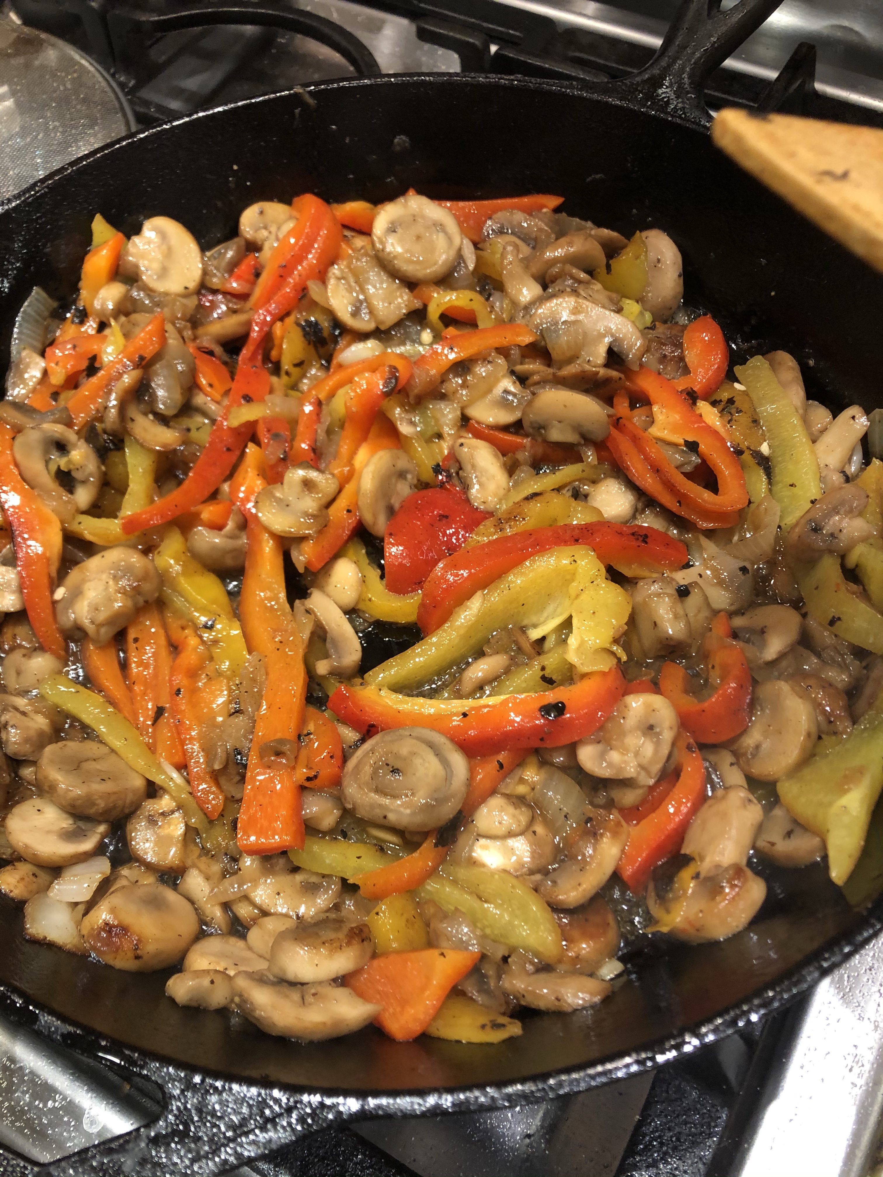 In the meantime, I cooked a half pound of bacon. Then I took it off and cooked down onions, mushrooms, and peppers. The peppers were smoked on the coals first, then sliced and added to the veggies.