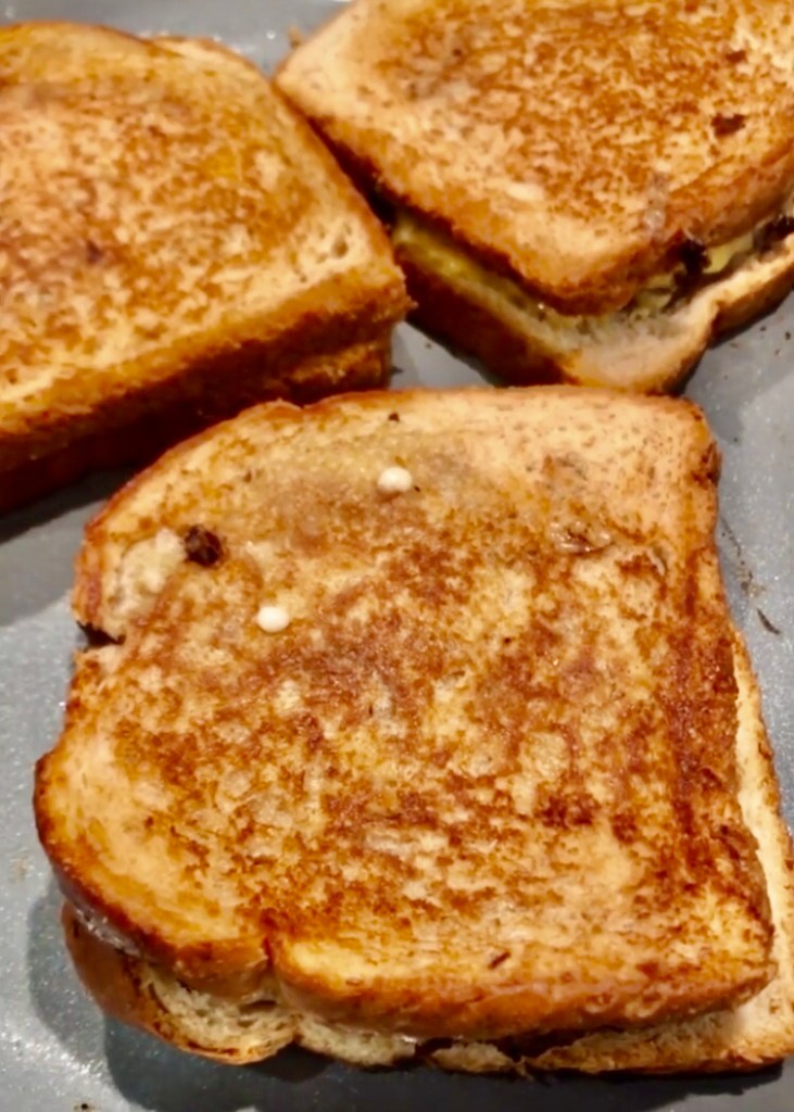 I assembled the sandwiches and buttered one side. In a large skillet on medium heat, I added the sandwiches butter side down. Then I took the cast iron skillet to weigh down the patty melts. Once it was golden brown and the cheese started to melt, I buttered the top side and flipped them. Make sure your heat is not too high, otherwise the bread will burn. I served with tator tots that I cooked in my air fryer and some creamed corn. Hit the spot!!!