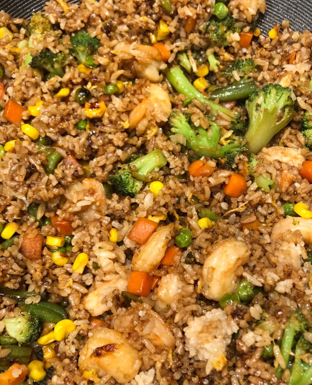 I took all the Chinese leftovers (veggie fried rice and basil chicken), mixed them with one egg and about a cup of breadcrumbs. I only had regular breadcrumbs, but Panko would work. Then in a hot pan with a few tablespoons of vegetable oil, I fried up this big pancake. You can make little ones, but this is lazy cooking summer! Plus it’s just me eating it, so any extra leftovers will go to my best friend Brutus 😉