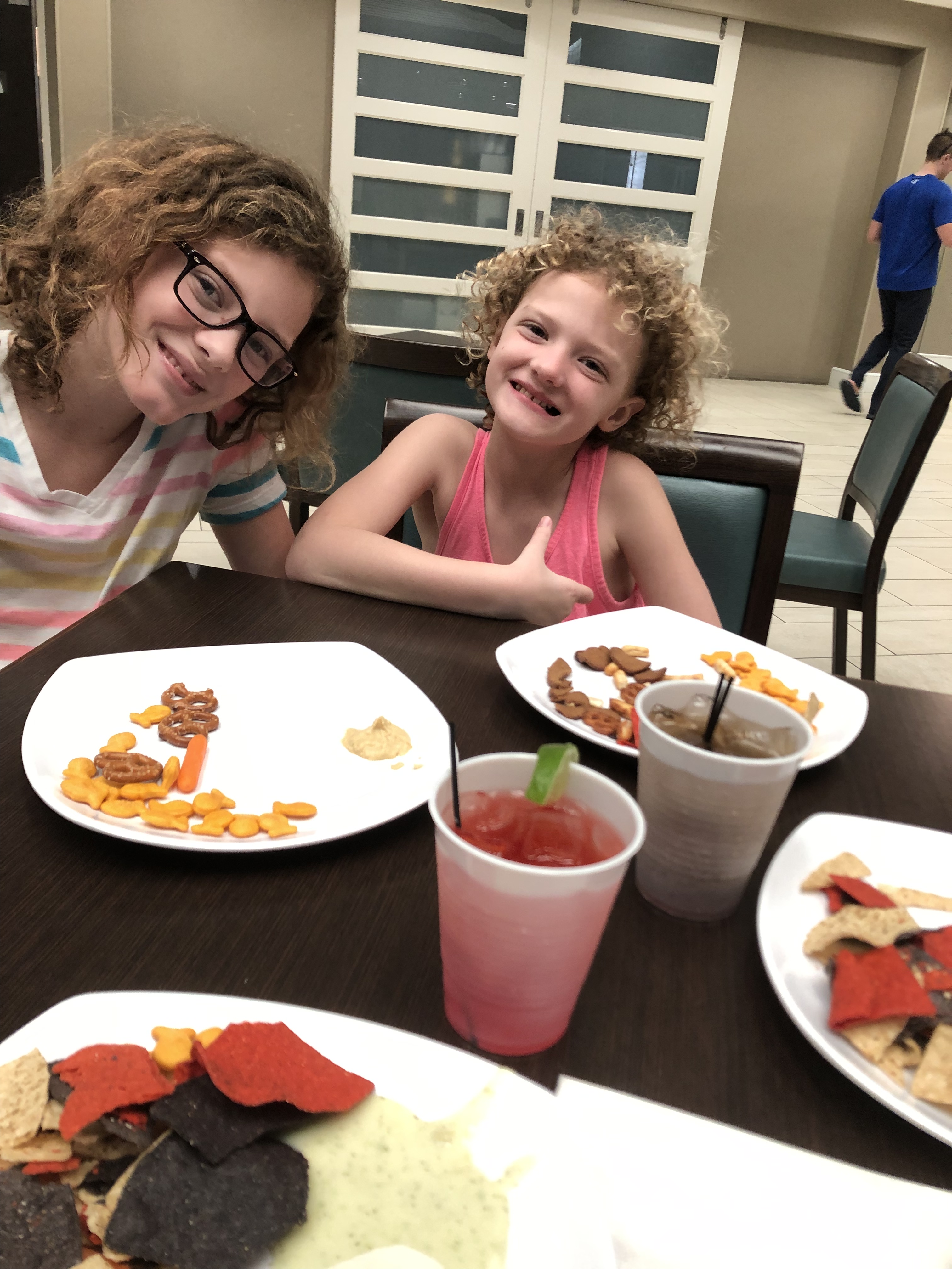 Next stop… Embassy Suites right outside the parks. Thanks to the hubby’s job, we have lots of points and perks staying here. I am sure that staying inside the park is magical, but this hotel was amazing! Amazing pool, kids corner (Wii, Nintendo, art, games, free cotton candy, etc), free breakfast, free happy hour, cheap pizza and ice cream all day and night, Disney movies streaming all day and night, plus basketball for the fans…