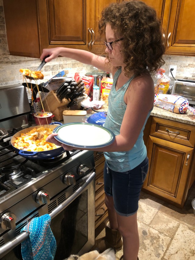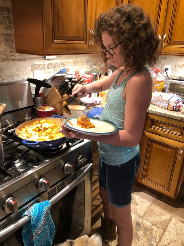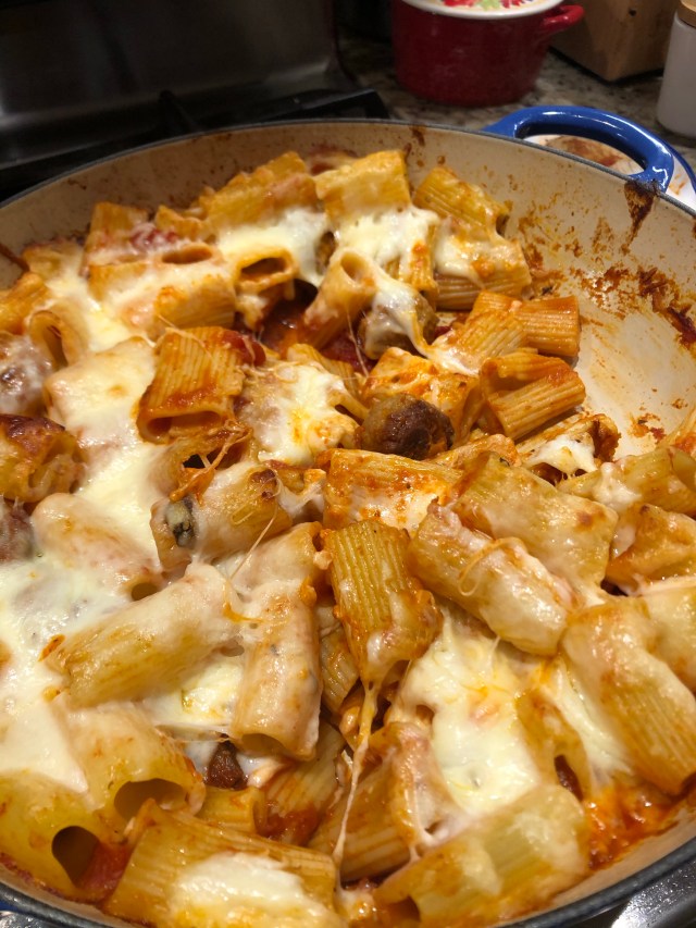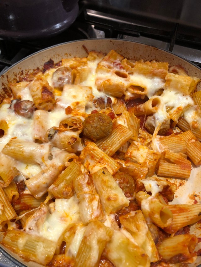 I have made versions of this meal before. It is a super easy throw together dish that is always a hit. I cooked the pasta in super salty water for about 6 minutes or so. It is going to cook more in the oven, so you don’t want it to get mushy. I browned the frozen meatballs in a bit of olive oil, then covered them with some jarred sauce. Then I added the pasta to the sauce and meatballs. I covered it with mozzarella cheese and baked until the cheese melted and had some pretty brown bubbly spots, about 30 minutes. I wasn’t able to get a picture before Rebecca dug in 😉 The 4 of us devoured the entire dish!